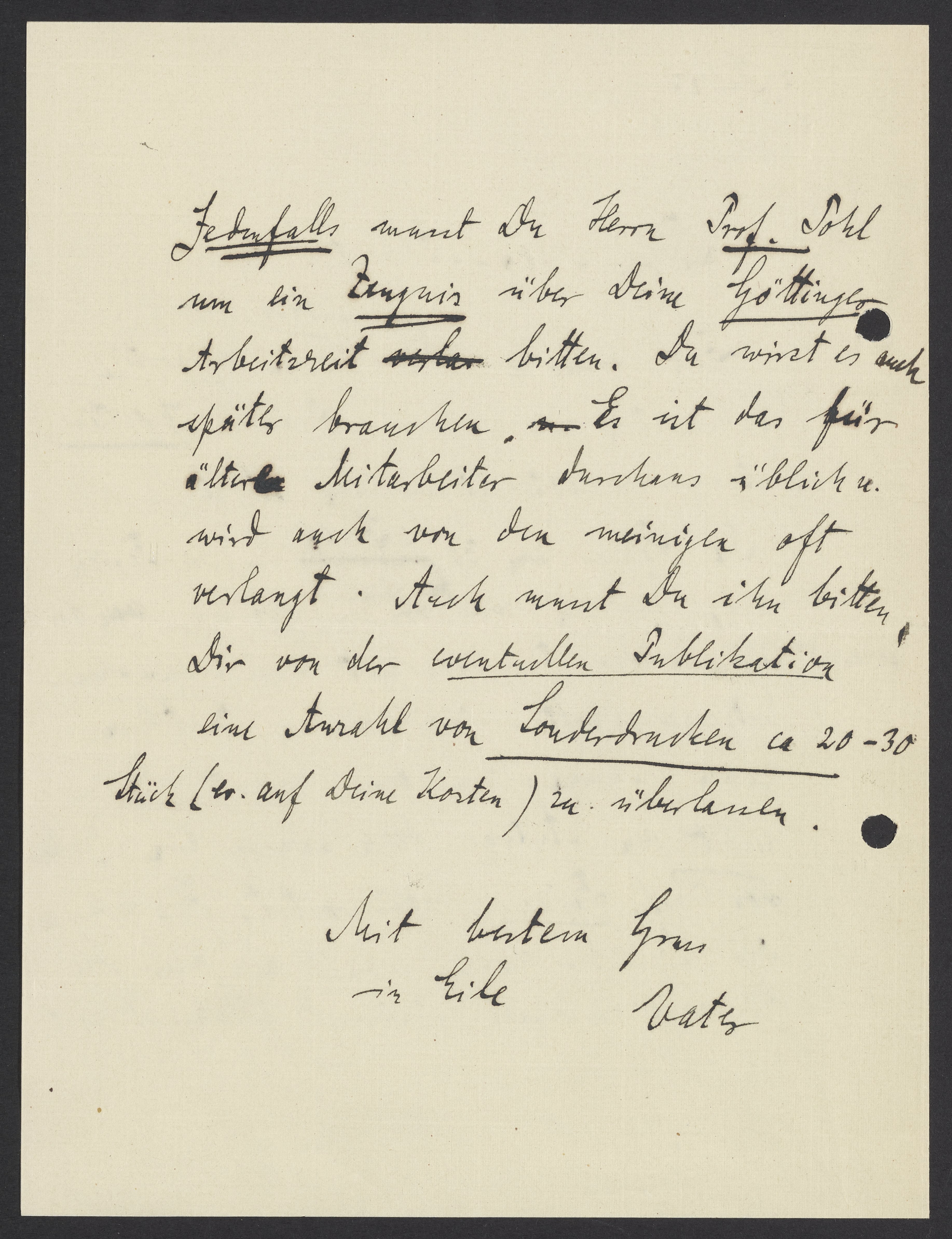 Jedenfalls musst Du Herrn Prof. Pohl um ein Zeugnis über Deine Goettinger Arbeitszeit bitten. Du wirst es auch später brauchen. Es ist das für altere Mitarbeiter durchaus üblich u. wird auch von den meinigen oft verlangt. Auch musst Du ihn bitten, Dir von der eventuellen Publikation eine Anzahl von Sonderdrucken ca 20-30 Stück (ev. auf Deine Kosten) zu überlassen.