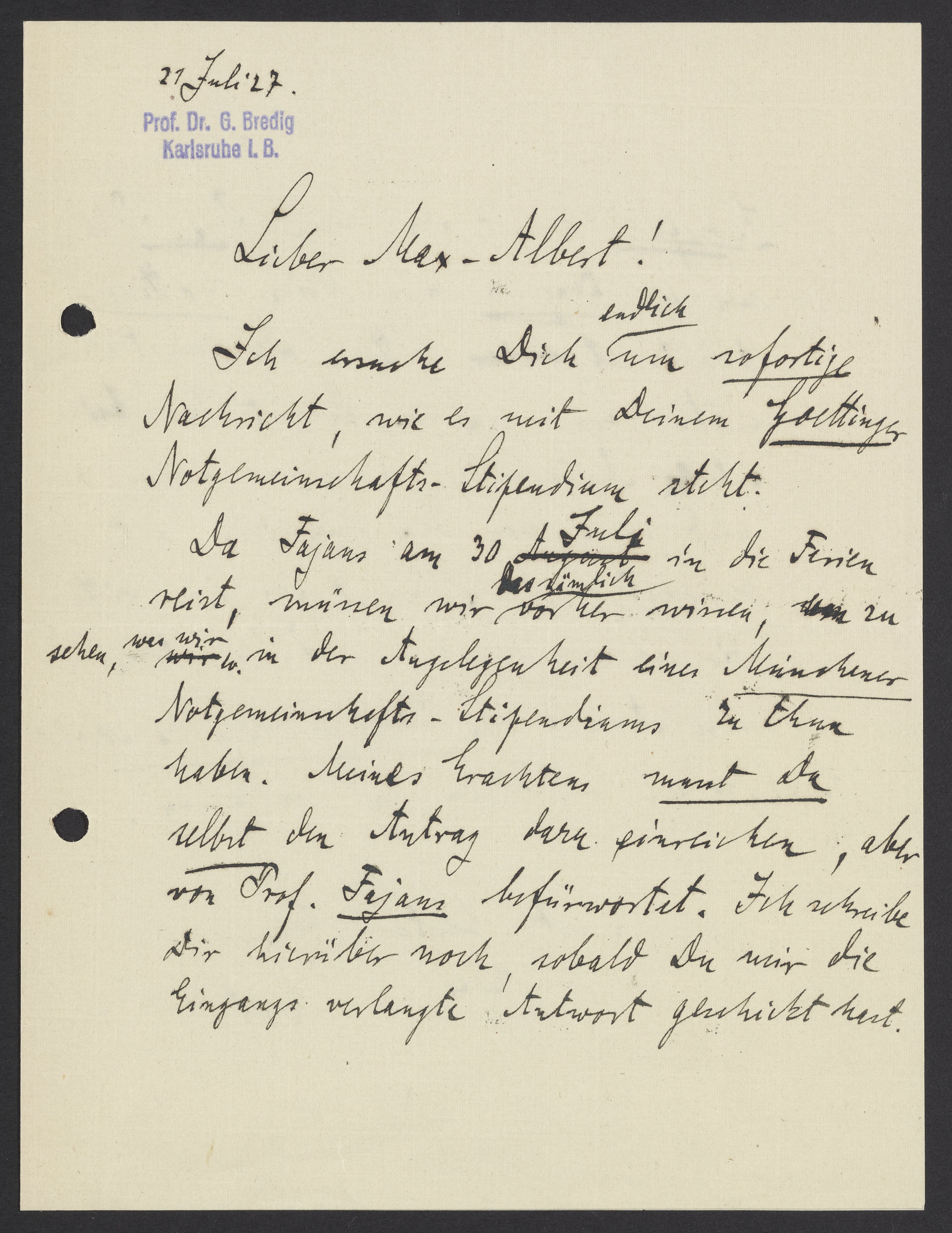 Da Fajans am 30. Juli in die Ferien reist, müssen wir das nämlich vorher wissen, um zu sehen, was wir in der Angelegenheit eines Münchner Notgemeinschafts-Stipendiums zu thun haben. Meines Erachtens musst Du selbst dazu einreichen, aber von Prof. Fajans befürwortet. Ich schreibe Dir hierüber noch, sobald Du mir die Eingangs verlangte Antwort geschickt hast.