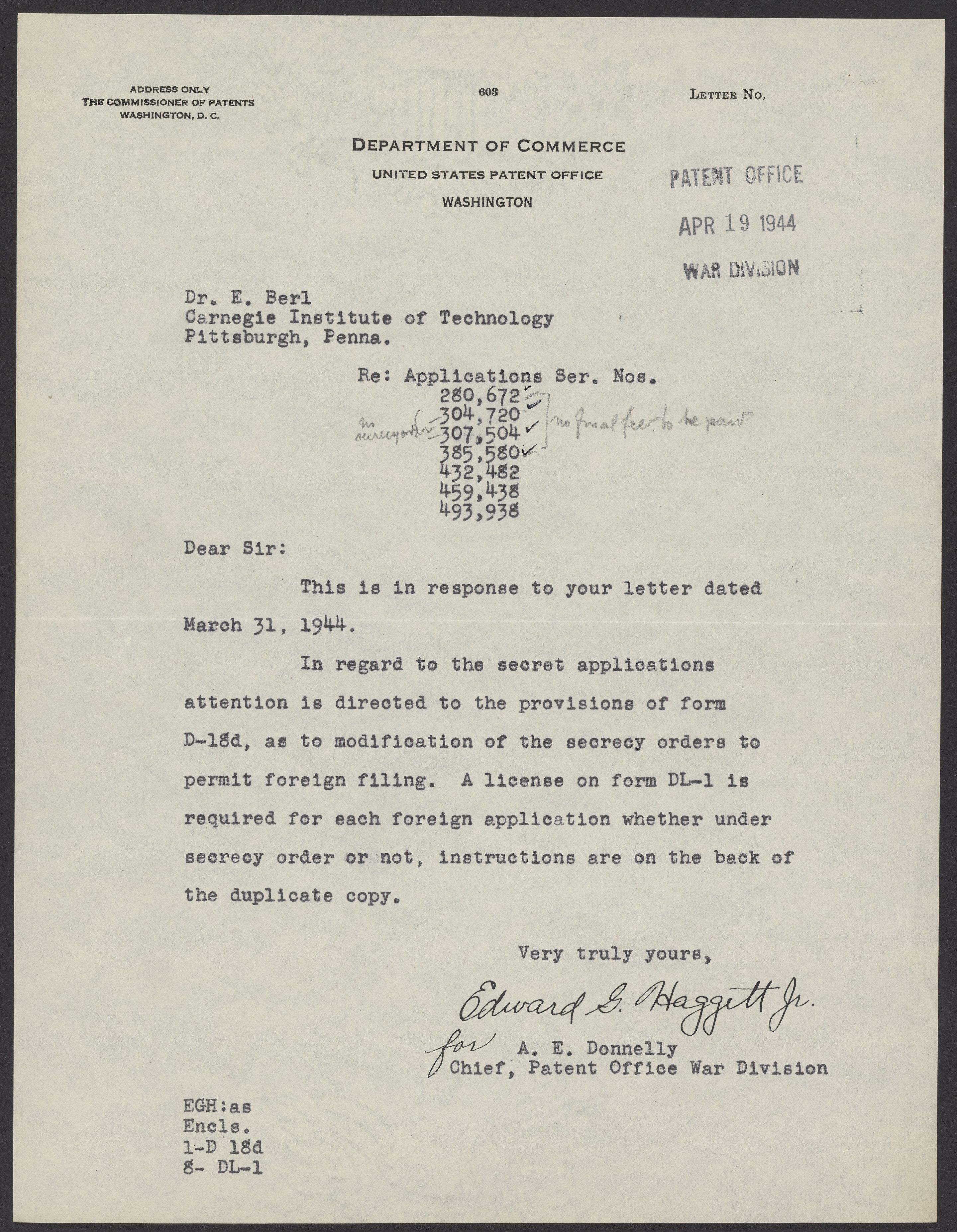 Letter from the United State Patent Office to Ernst Berl, April 19, 1944