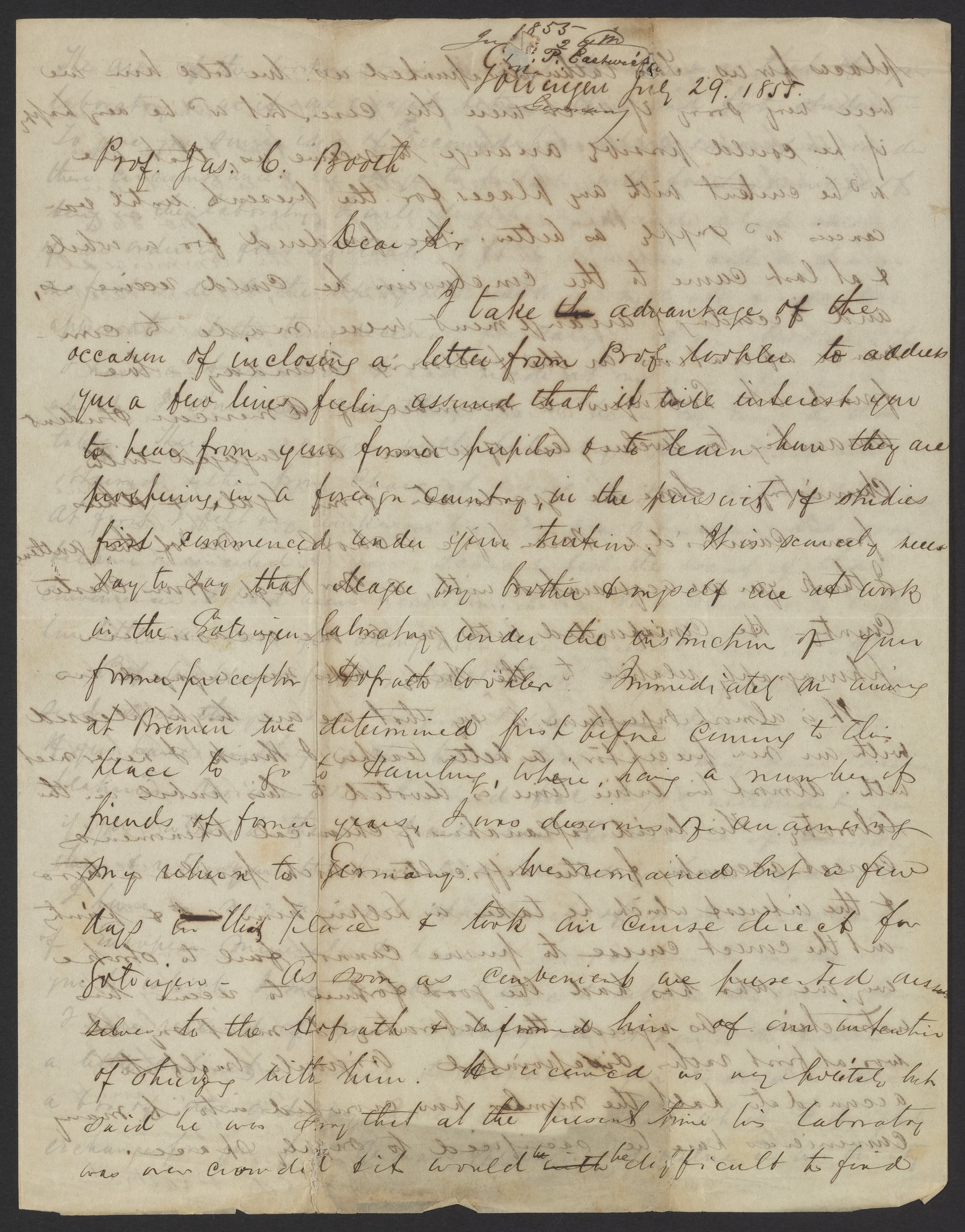 Letter from Friedrich Wöhler to James Curtis Booth, July 29, 1855