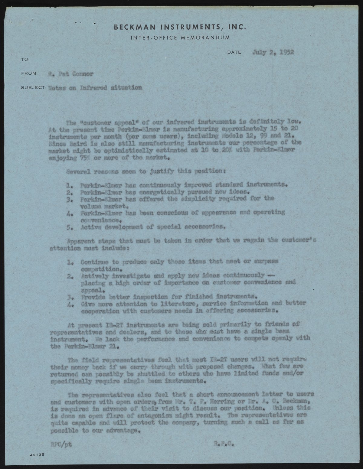 This internal memo documents concerns about Beckman Instruments' reputation in the infrared spectroscopy field. These concerns are due to fierce competition from Perkin-Elmer and problems with the Beckman IR-2T. At the time of this memo, Beckman Instruments staff were quickly working to address multiple issues with the IR-2T, which became apparent only after the instrument was on the market.