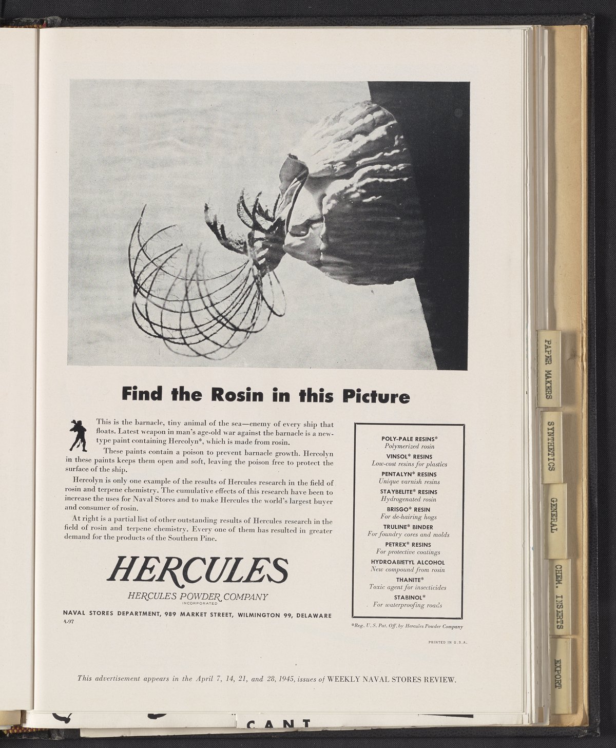 Hercules Incorporated. “Find the Rosin in This Picture.” 1945 Hercules Advertisements, 1945. Records of Hercules Incorporated, Volume 1945. Science History Institute. Philadelphia. https://digital.sciencehistory.org/works/5999n4045.