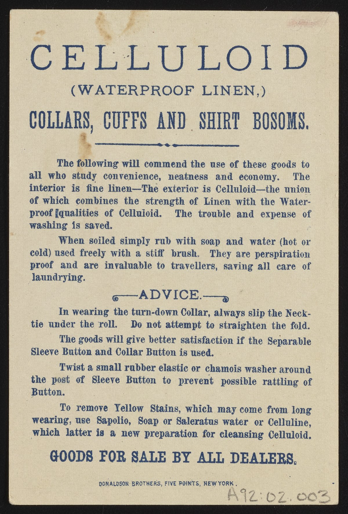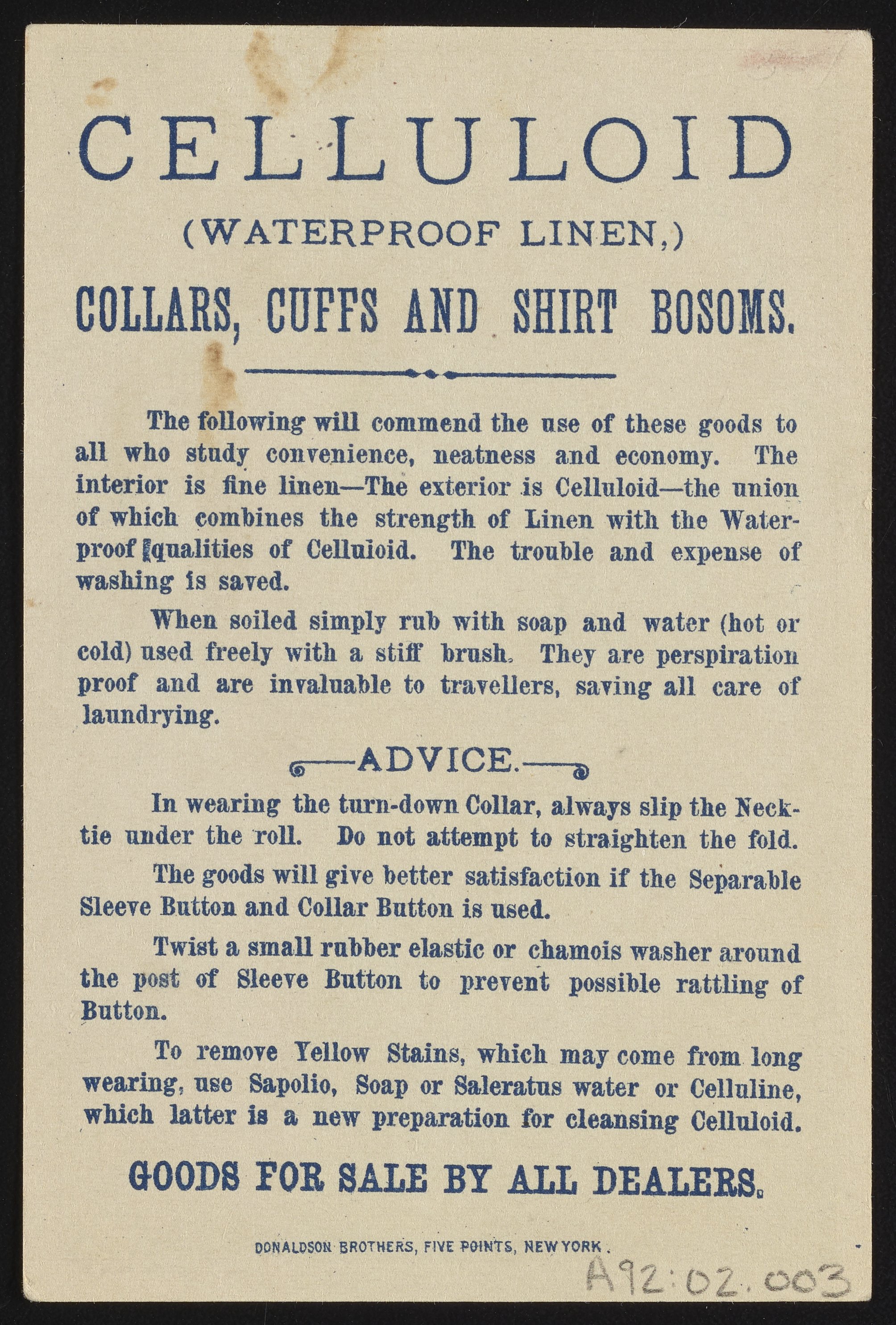 Small JPG1200 x 1766px — 711 KBFull-sized JPG2018 x 2970px — 1.7 MBOriginal fileTIFF — 2018 x 2970px — 17.2 MBTrade card for waterproof celluloid collars, cuffs, and shirt bosoms depicts a boy sailing on a cuff, demonstrating their waterproof appeal. Verso includes an advertisement for celluloid products along with advice for wearing and care.