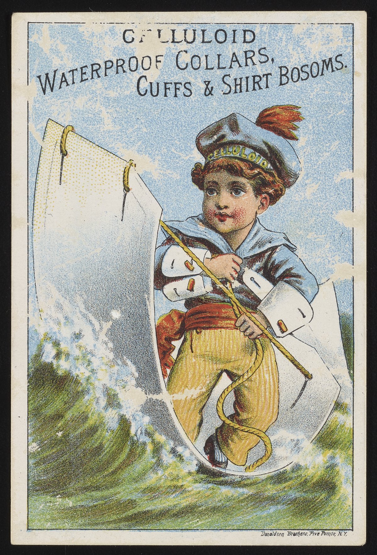 “Trade Card for Celluloid Waterproof Collars, Cuffs, and Shirt Bosoms with Boy Sailing.” Lithographic ink. Five Points, New York, New York: Donaldson Brothers (Firm), circa 1890. Science History Institute. Philadelphia. https://digital.sciencehistory.org/works/5999n455n.