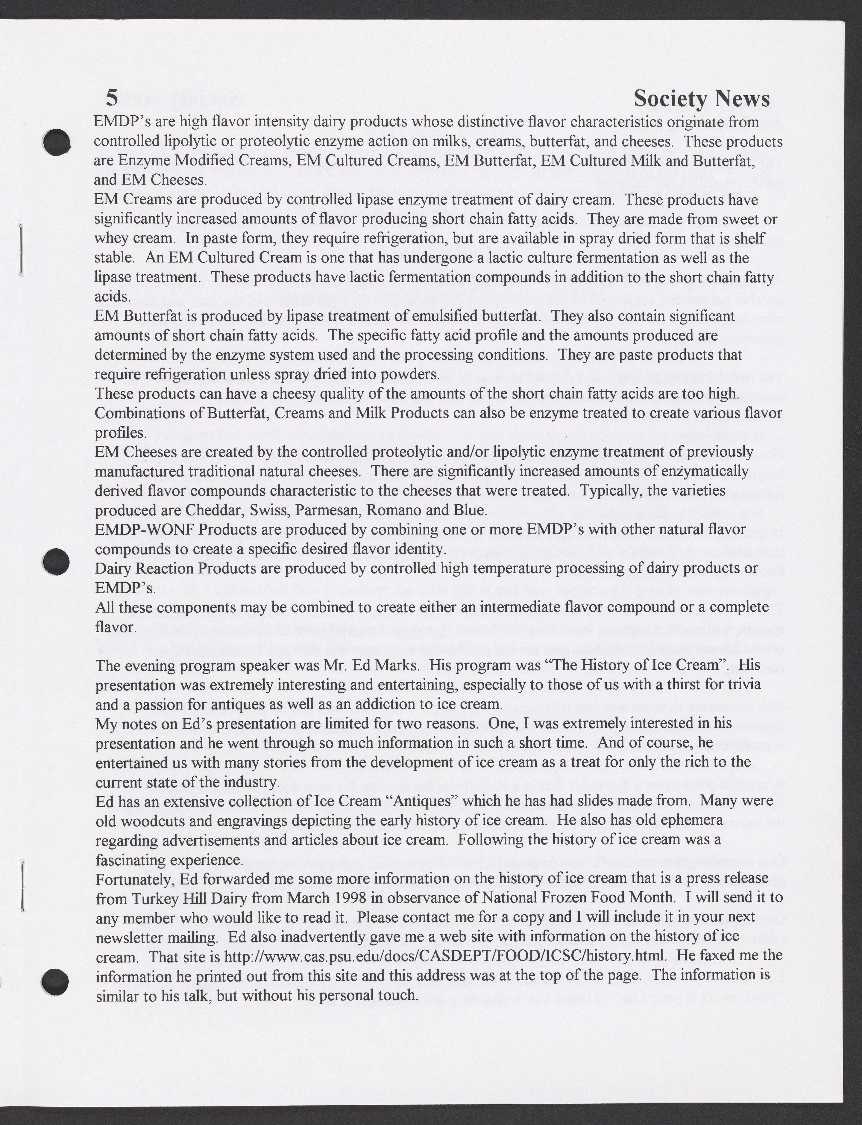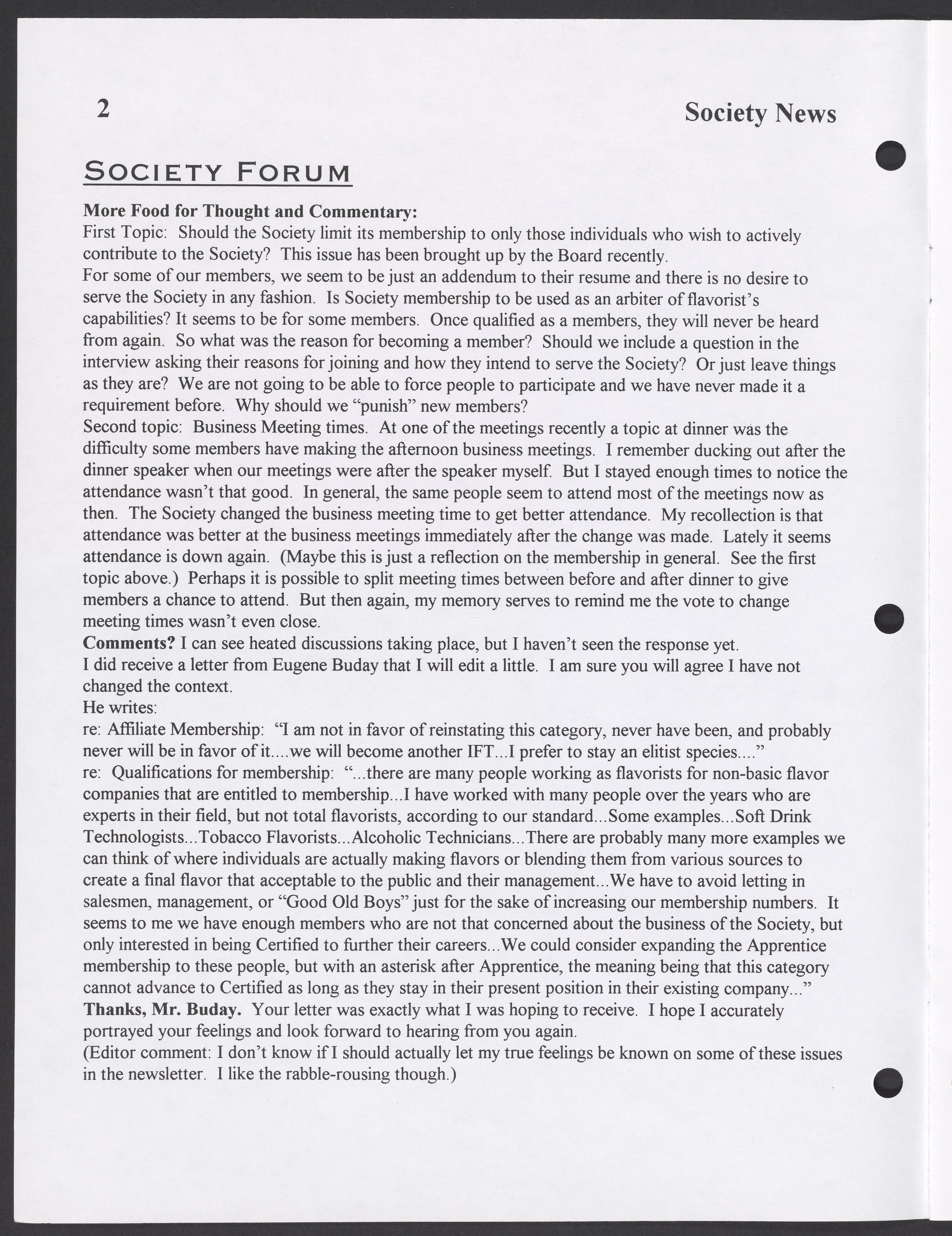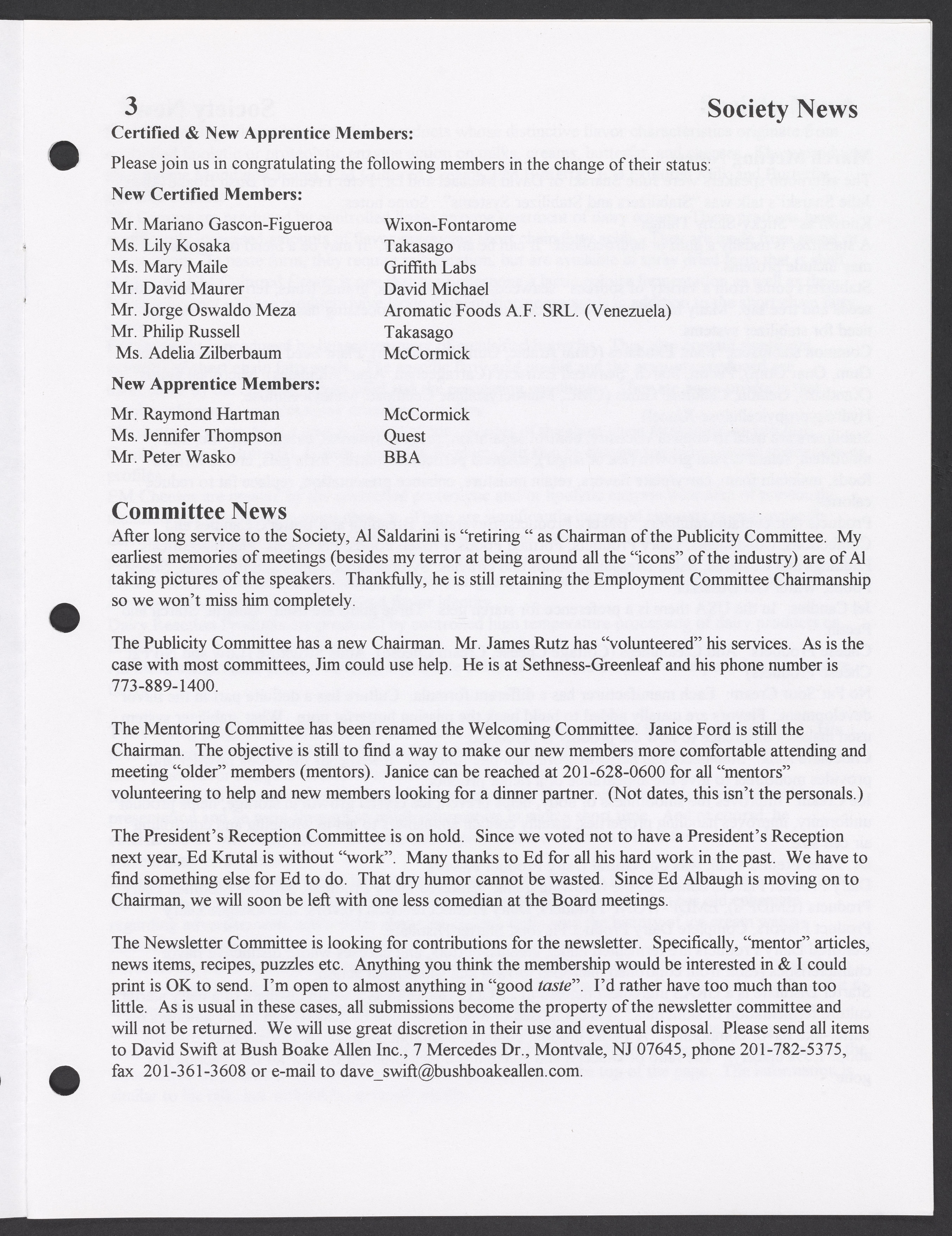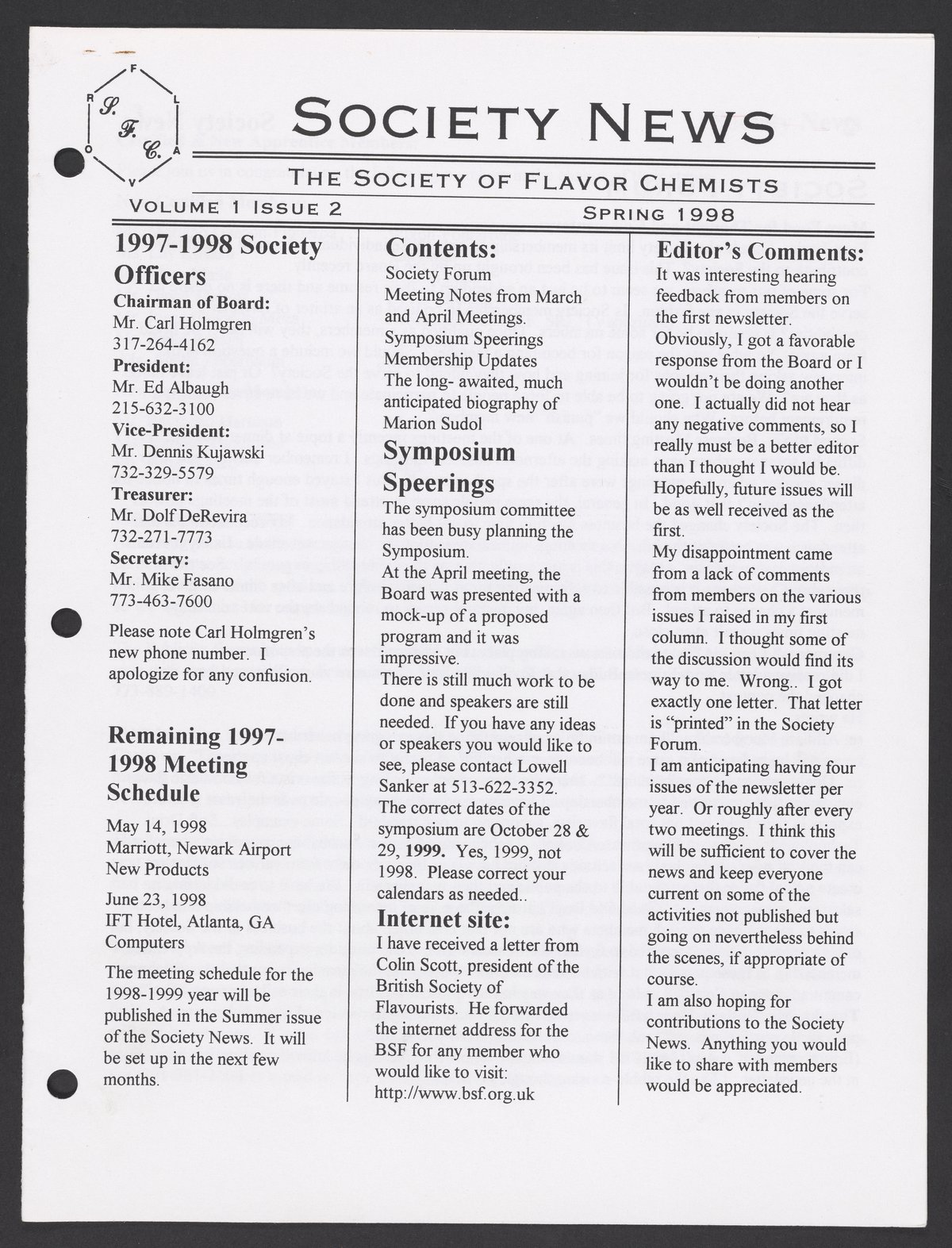 Society of Flavor Chemists. “Society News, Volume 1, Issue 2,” 1998. Society of Flavor Chemists, Society News, Box 1, Folder 2. Science History Institute. Philadelphia. https://digital.sciencehistory.org/works/5bvx67r.