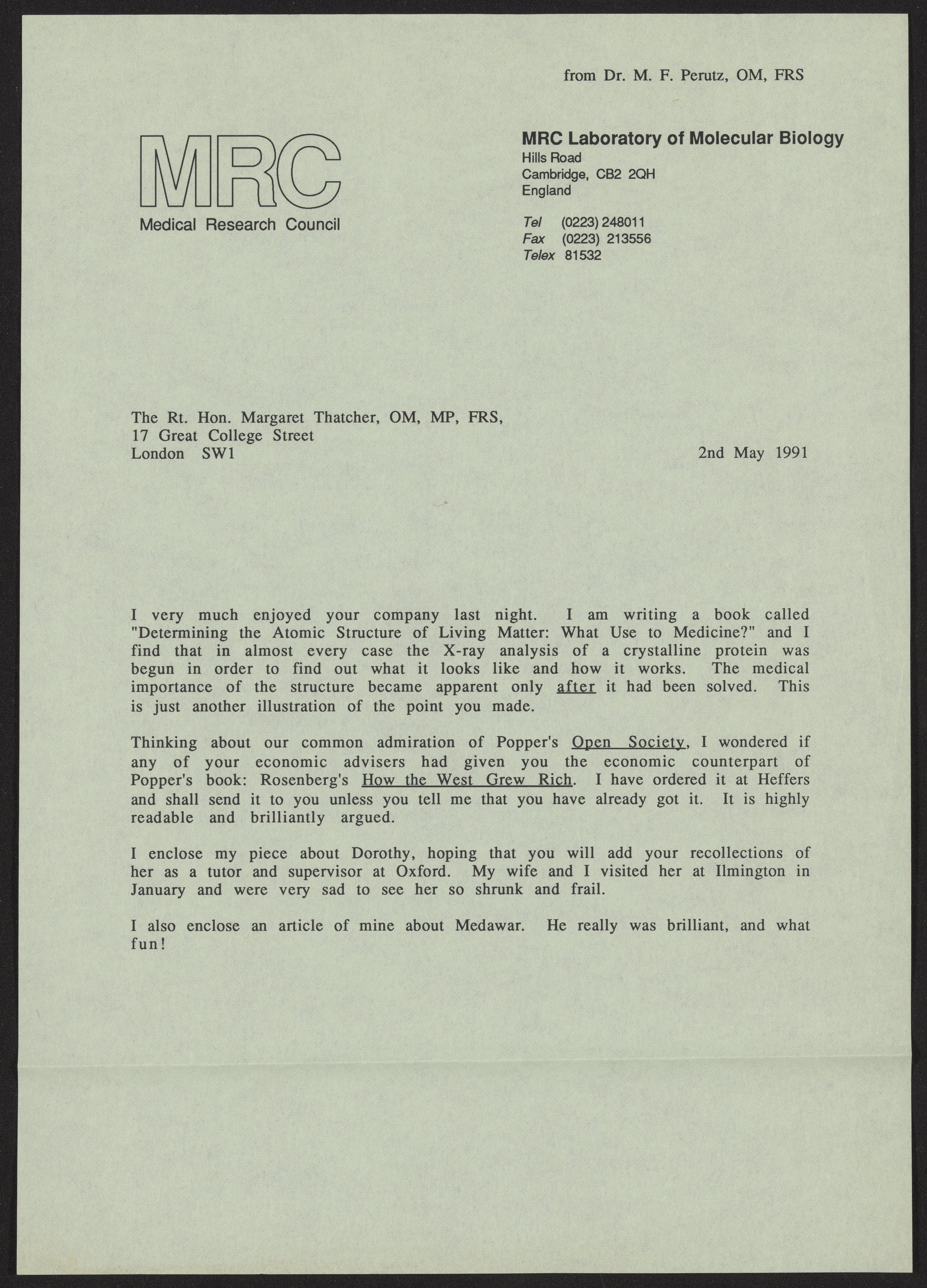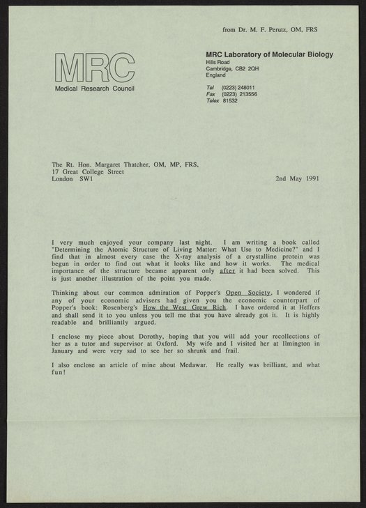 Letter from Max Perutz to Margaret Thatcher, May 2, 1991