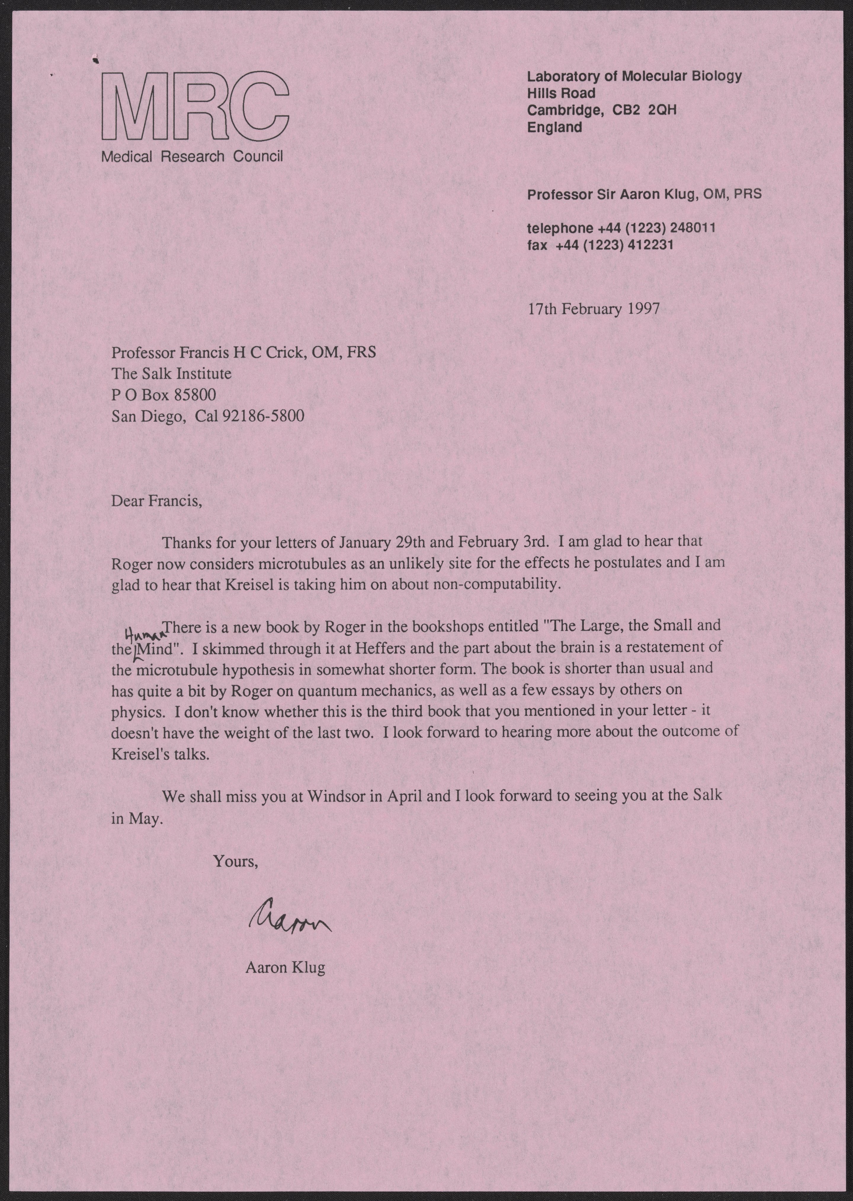 Klug, A. (Aaron), Sir. “Letter from Aaron Klug to Francis Crick, February 17, 1997,” February 17, 1997. History of Molecular Biology Collection, Box 20, Folder 6. Science History Institute. Philadelphia. https://digital.sciencehistory.org/works/5l56e0c.