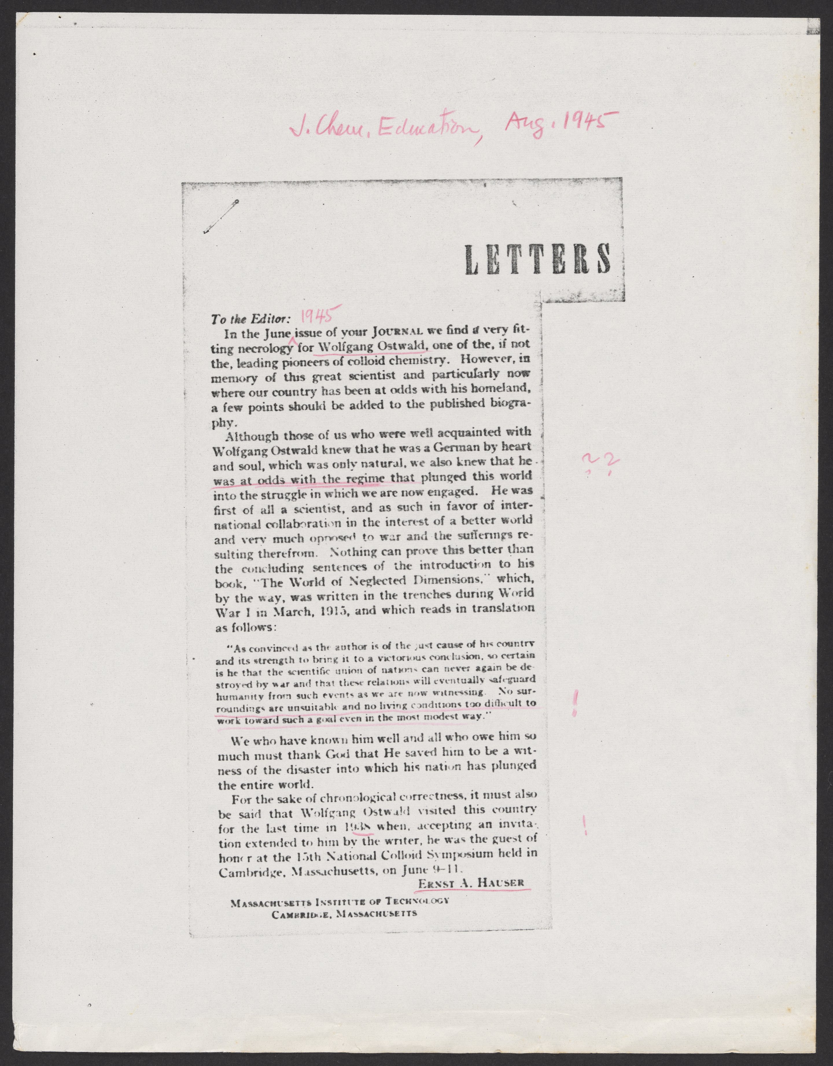 Ernst A. Hauser's letter to the editor of the Journal of Chemical Education, August 1945