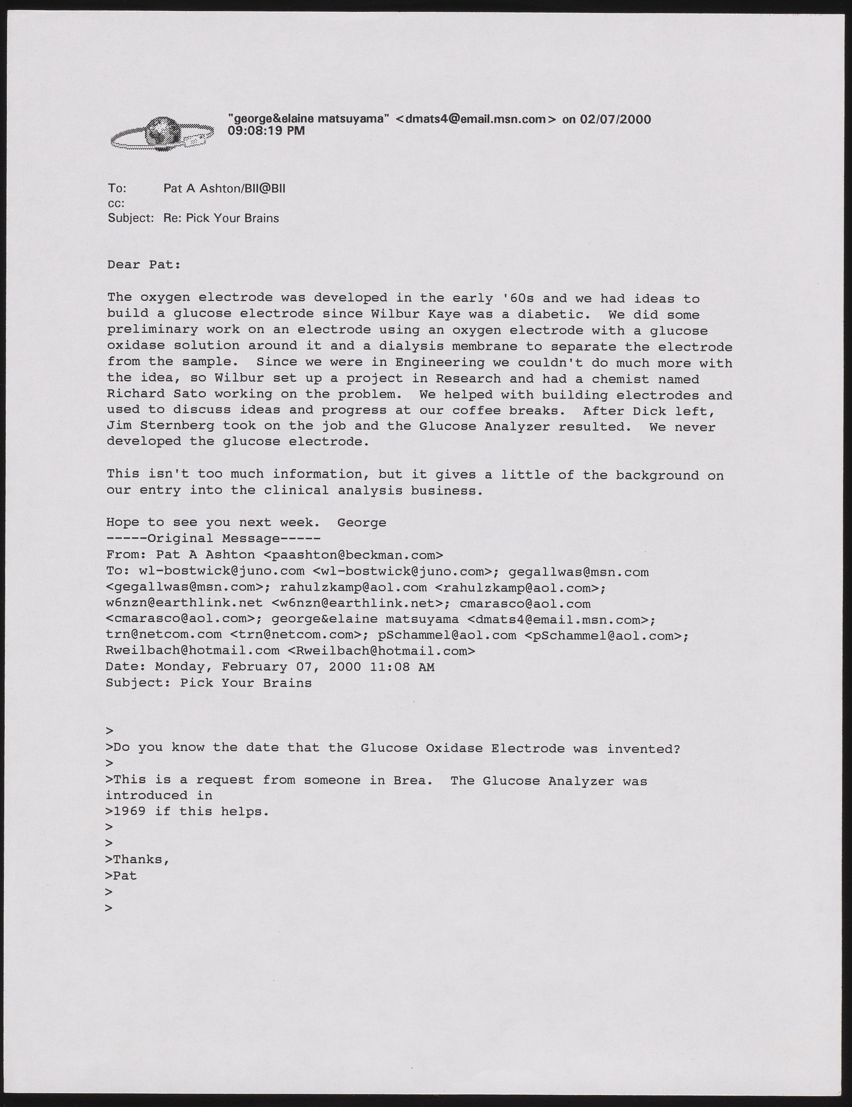 Matsuyama, George. “Email from George Matsuyama to Pat A. Ashton,” February 7, 2000. Beckman Historical Collection, Box 17, Folder 29. Science History Institute. Philadelphia. https://digital.sciencehistory.org/works/5m60qr91n.
