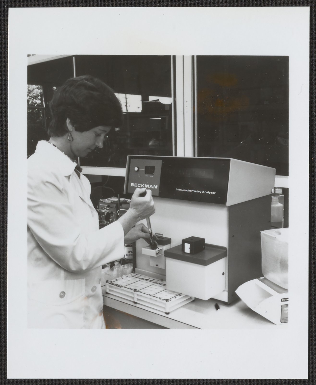“Woman Using a Beckman Immunochemistry Analyzer,” n.d. Beckman Historical Collection, Box 84. Science History Institute. Philadelphia. https://digital.sciencehistory.org/works/5m60qs10n.