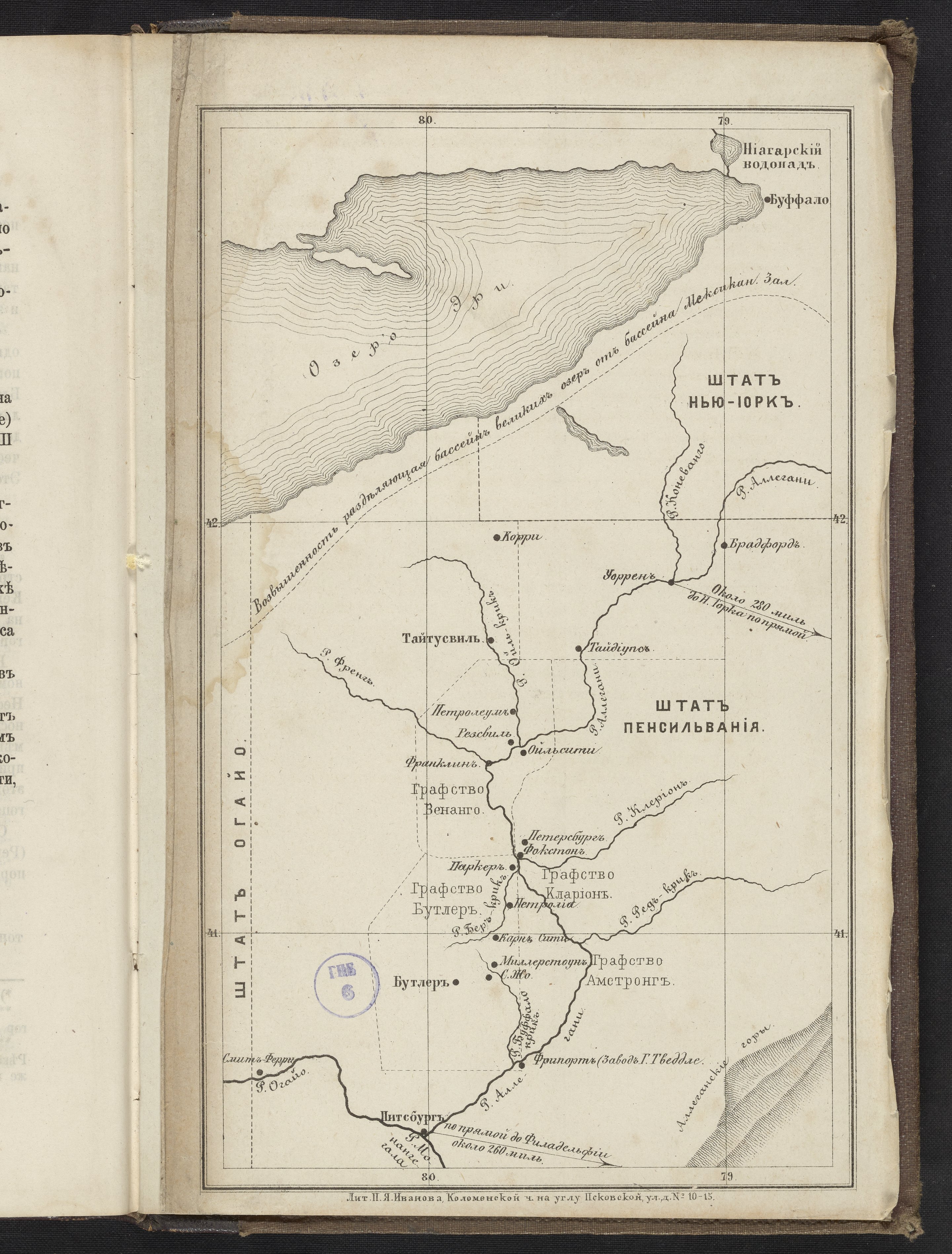 Mendeleyev, Dmitry Ivanovich. “Map of Western Pennsylvania with Oil Production Centers.” In Neft︠i︡ana︠i︡a Promyshlennostʹ v s︠i︡evero-Amerikanskom shtat︠i︡e Pensilʹvanīi i Na Kavkaze. Saint Petersburg, Russia (Federation): Tipografia tovaritchestva Obshchestvenna︠i︡a polʹza, 1877. https://digital.sciencehistory.org/works/5mm0m0y.