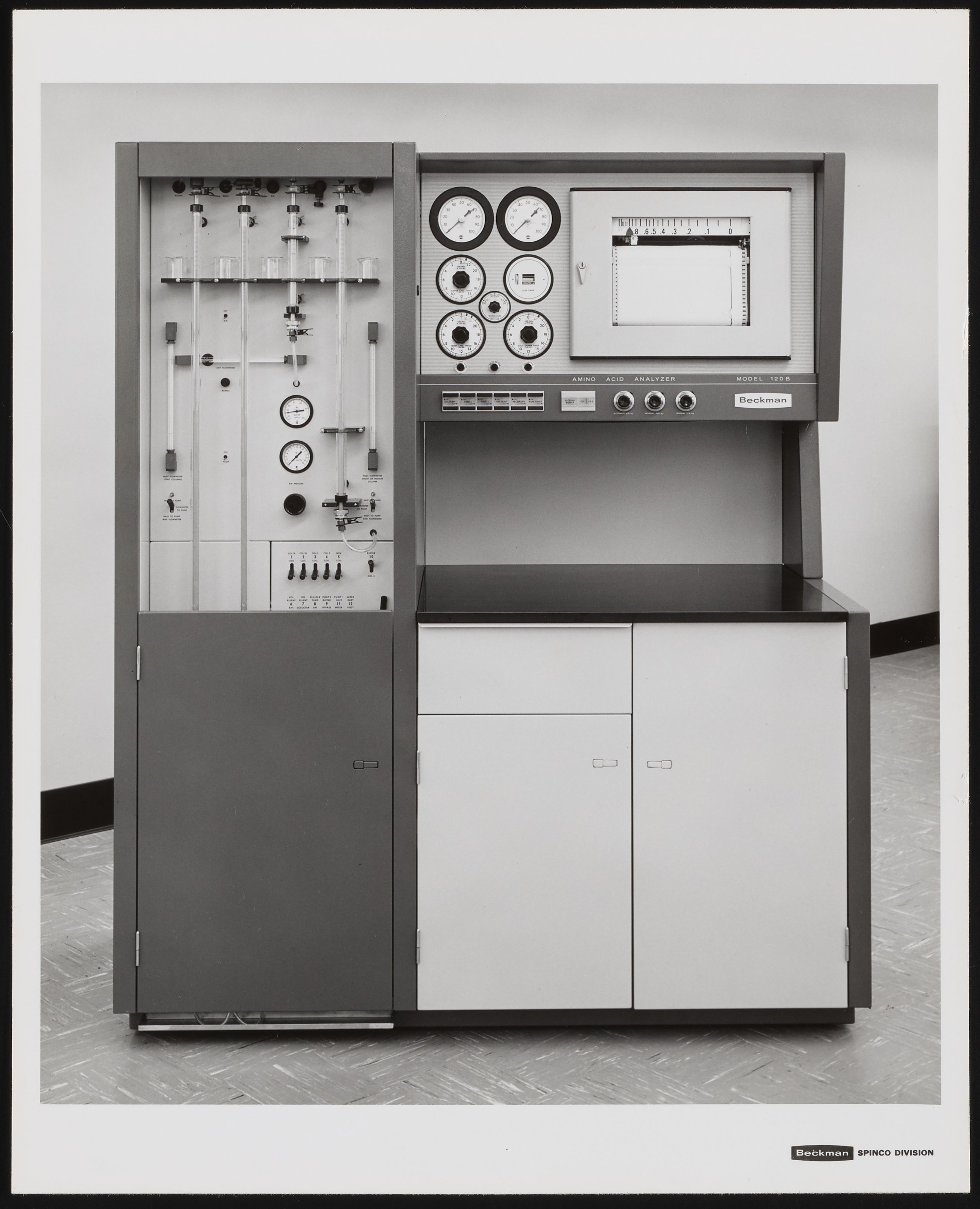 “Spinco Model 120B Amino Acid Analyzer,” 1960–1969. Beckman Historical Collection, Box 59, Folder 97. Science History Institute. Philadelphia. https://digital.sciencehistory.org/works/5q47rn88v.