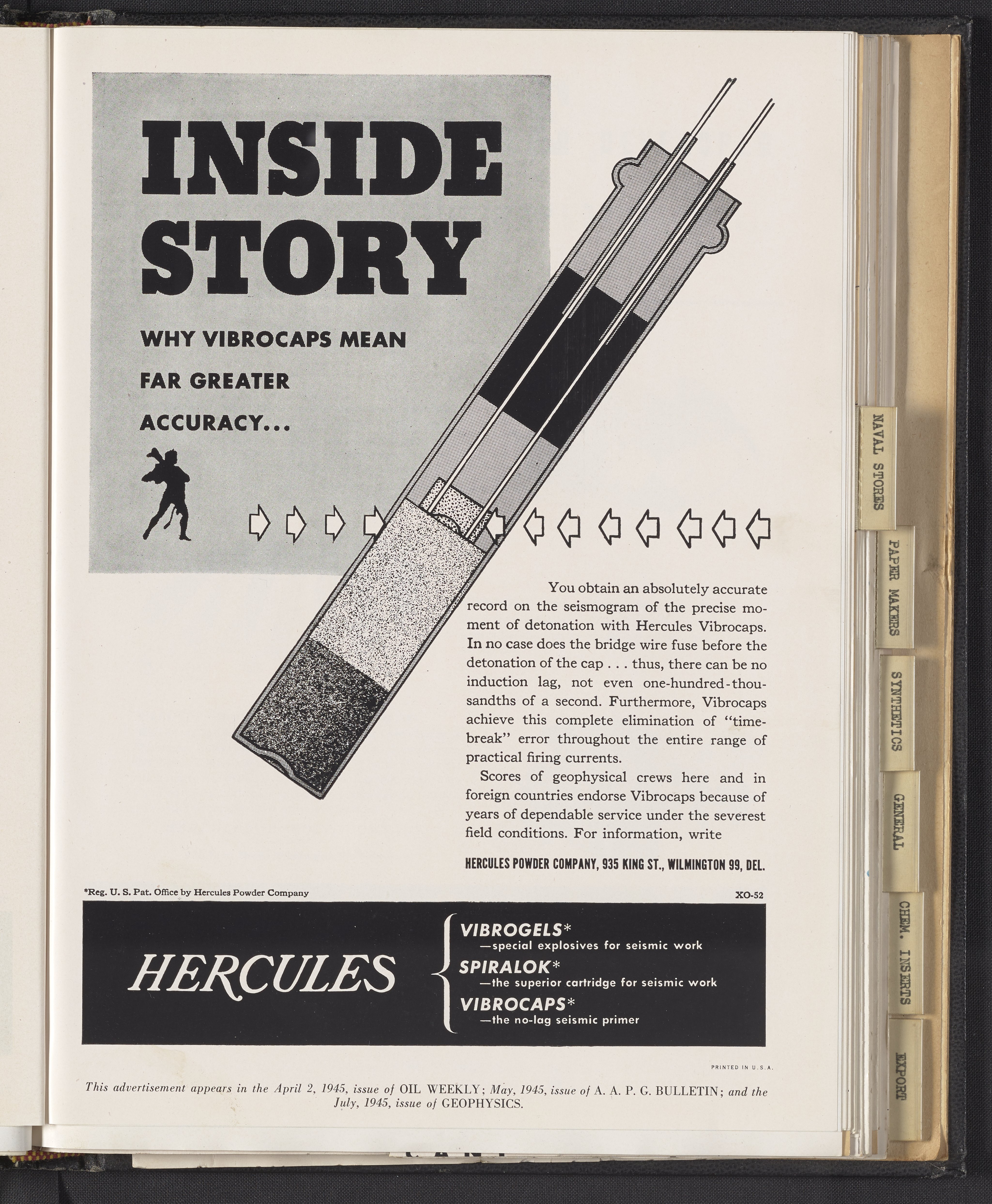 Hercules Incorporated. “Inside Story: Why Vibrocaps Mean Far Greater Accuracy...” 1945 Hercules Advertisements, 1945. Records of Hercules Incorporated, Volume 1945. Science History Institute. Philadelphia. https://digital.sciencehistory.org/works/5q47rp52p.