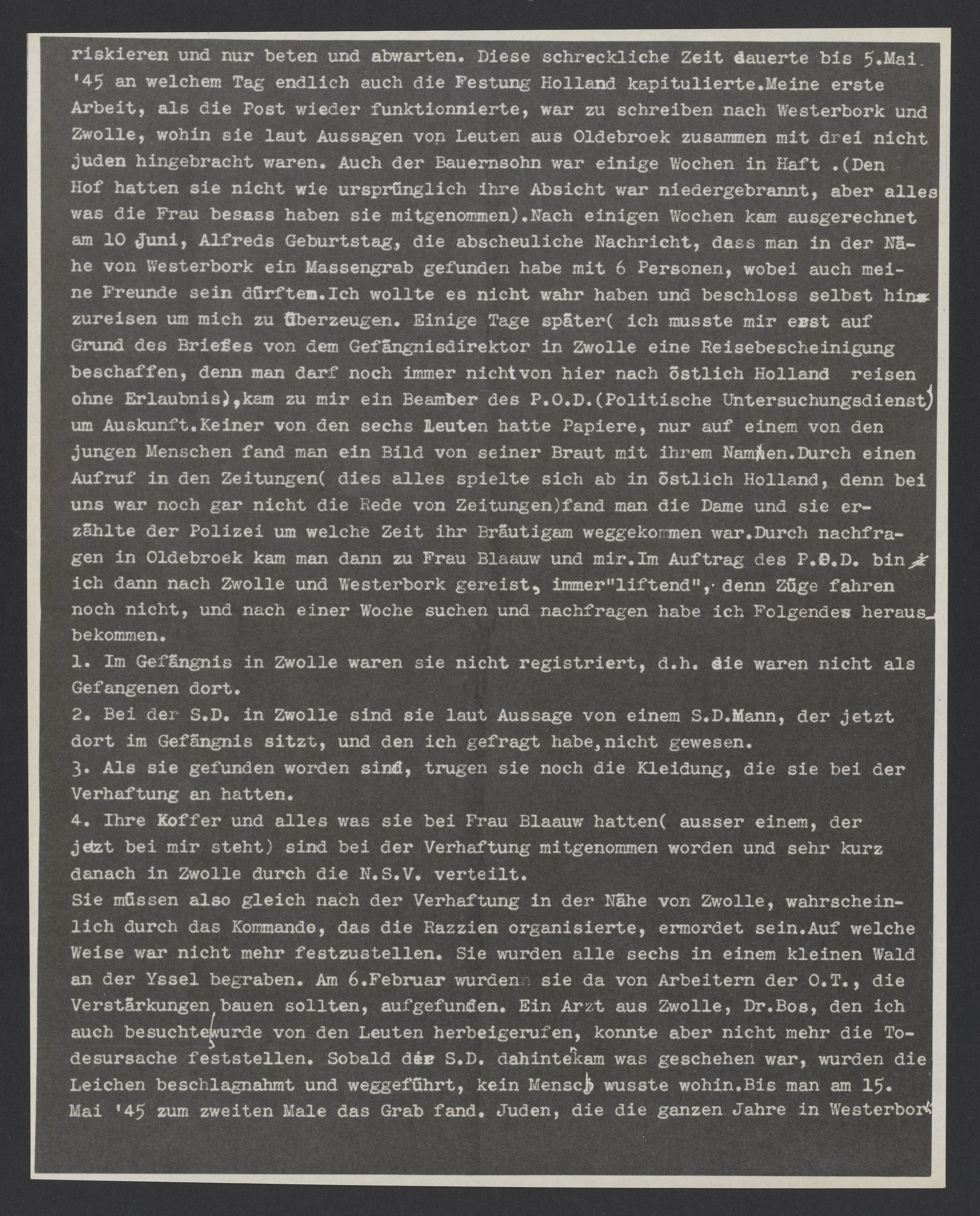 riskieren und nur beten und abwarten. Diese schreckliche Zeit dauerte bis 5. Mai '45 an welchem Tag endlich auch die Festung Holland kapitulierte. Meine erste Arbeit, als die Post wieder funktionierte, war zu schreiben nach Westerbork und Zwolle, wohin sie laut Aussagen von Leuten aus Olderbroek zusammen mit drei nicht Juden hingebracht waren. Auch der Bauernsohn war einige Wochen in Haft. (Den Hof hatten sie nicht wie ursprünglich ihre Absicht war niedergebrannt, aber alles was die Frau besass haben sie mitgenommen). Nach einigen Wochen kam ausgerechnet am 10 Juni, Alfreds Geburtstag, die abscheuliche Nachricht, dass man in der Nähe von Westerbork ein Massengrab gefunden habe mit 6 Personen, wobei auch meine Freunde sein dürften. Ich wollte es nicht wahr haben und beschloss selbst hinzureisen um mich zu überzeugen. Einige Tage später (ich musste mir erst auf Grund des Briefes von dem Gefängnisdirektor in Zwolle eine Reisebescheinigung beschaffen, denn man darf noch immer nicht von hier nach östlich Holland reisen (ohne Erlaubnis), kam zu mir ein Beamter des P.O.D (Politische Untersuchungsdienst) um Auskunft. Keiner von den sechs Leuten hatte Papiere, nur auf einem von den jungen Menschen fand man ein Bild von seiner Braut mit ihrem Namen. Durch einen Aufruf in den Zeitungen (dies alles spielte sich ab in östlich Holland, denn bei uns war noch gar nicht die Rede von Zeitungen) fand man die Dame und sie erzählte der Polizei um welche Zeit ihr Bräutigam weggekommen war. Durch nachfragen in Oldbroek kam man dann zu Frau Blaaw und mir. Im Auftrag des P.O.D. bin ich dann nach Zwolle und Westerbork gereist, immer "liftend“, denn Züge fahren noch nicht, und nach einer Woche suchen und nachfragen habe ich Folgendes herausbekommen: