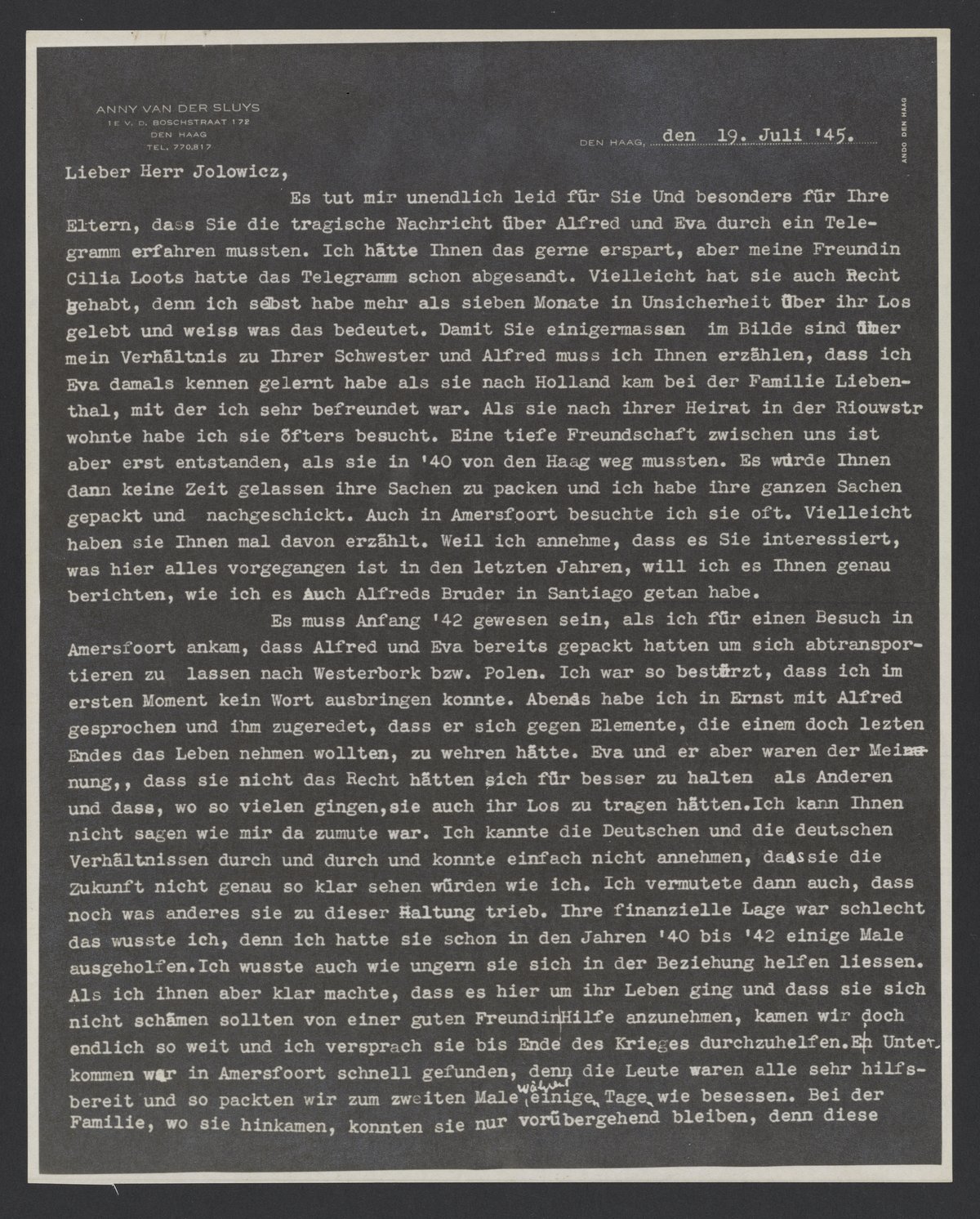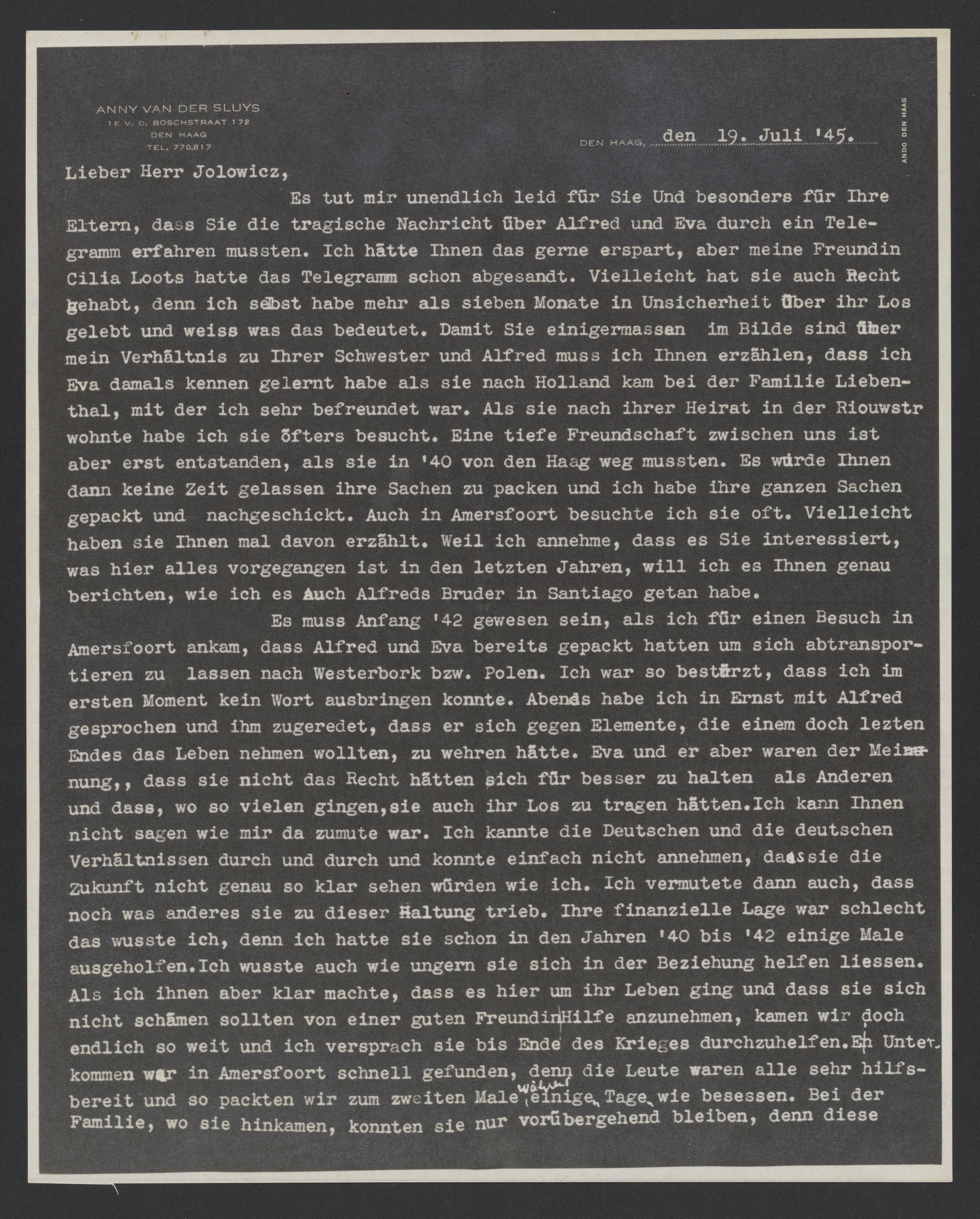 Es tut mir leid für Sie und besonders für Ihre Eltern, dass Sie die tragische Nachricht über Alfred und Eva durch ein Telegramm erfahren mussten. Ich hätte Ihnen das gerne erspart, aber meine Freundin Cilia Loots hatte das Telegramm schon abgesandt. Vielleicht hat sie auch Recht gehabt, denn ich selbst habe mehr als sieben Monate in Unsicherheit über ihr Los gelebt und weiss was das bedeutet. Damit Sie einigermassen im Bilde sind über mein Verhältnis zu Ihrer Schwester und Alfred muss ich Ihnen erzählen, dass ich Eva damals kennen gelernt habe als sie nach Holland kam bei der Familie Liebenthal, mit ich sehr befreundet war. Als sie nach ihrer Heirat in der Riouwstr. wohnte habe ich sie öfters besucht. Eine tiefe Freundschaft zwischen uns ist aber erst entstanden, als sie in '40 von den Haag weg mussten. Es wurde Ihnen dann keine Zeit gelassen ihre Sachen zu packen und ich habe ihre ganzen Sachen gepackt und nachgeschickt. Auch in Amersfoort besuchte ich sie oft. Vielleicht haben sie Ihnen mal davon erzählt. Weil ich annehme, dass es Sie interessiert, was hier alles vorgegangen ist in den letzten Jahren, will ich es Ihnen genau berichten, wie ich es auch Alfreds Bruder in Santiago getan habe.