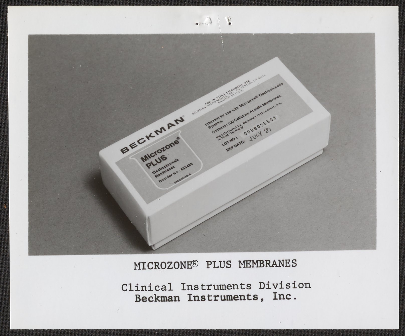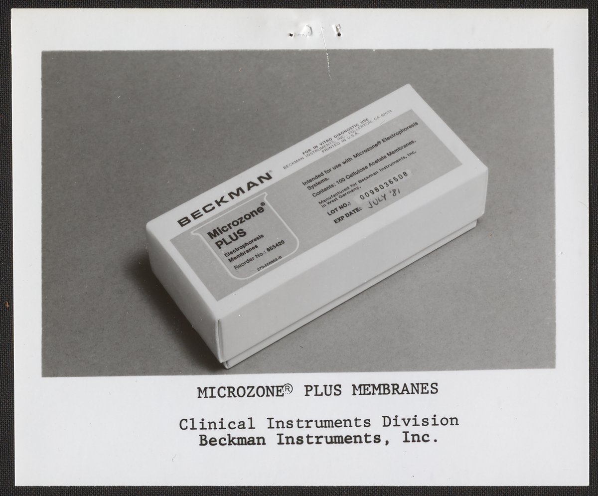 “Beckman Microzone Plus Membranes,” circa 1981. Beckman Historical Collection, Box 84. Science History Institute. Philadelphia. https://digital.sciencehistory.org/works/5t34sj89c.