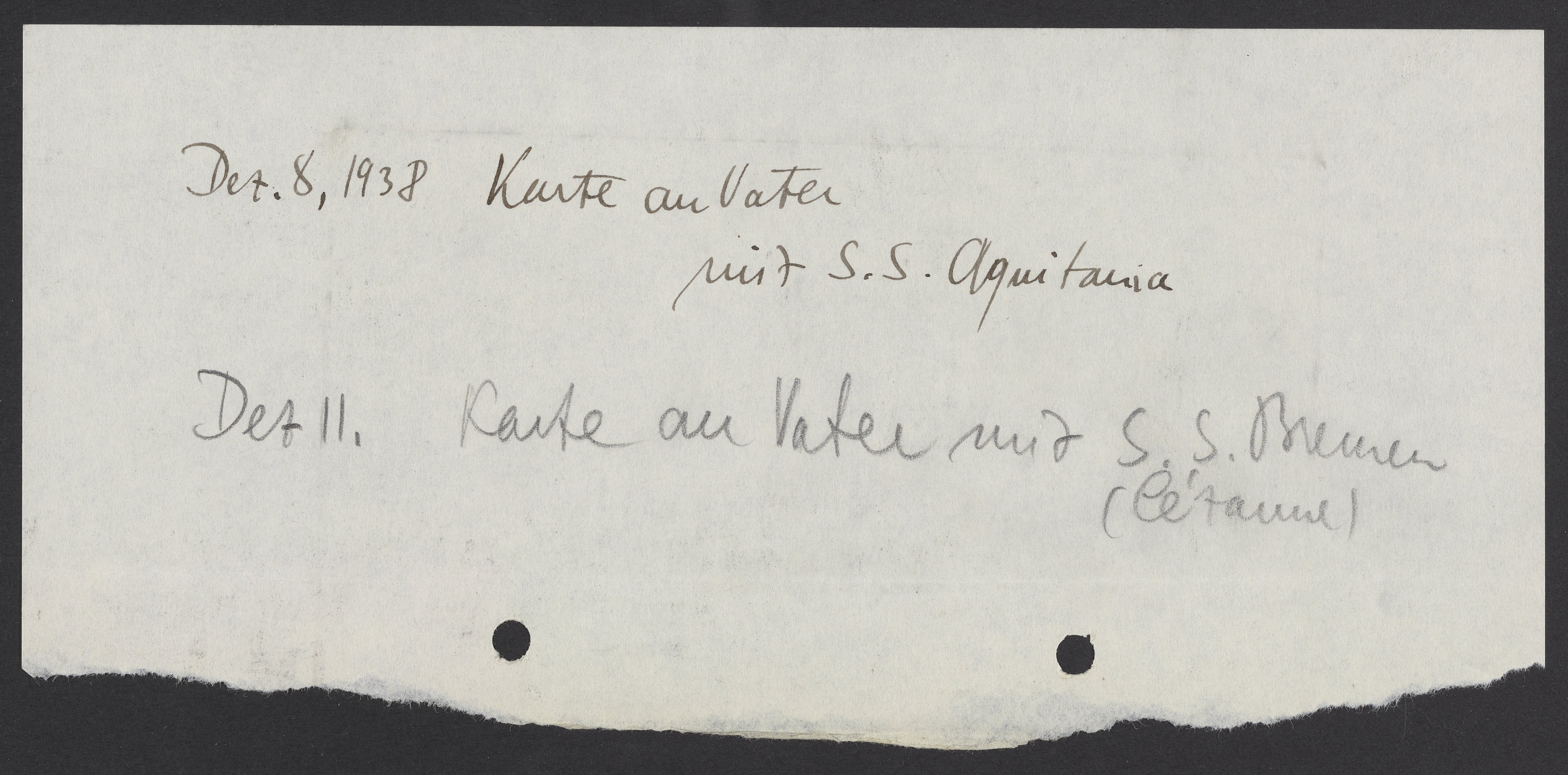 Max Bredig (1902-1977) records the dates of postcards sent to his father, Georg Bredig (1868-1944) in late 1938. Max also notes which ships carried the correspondence.