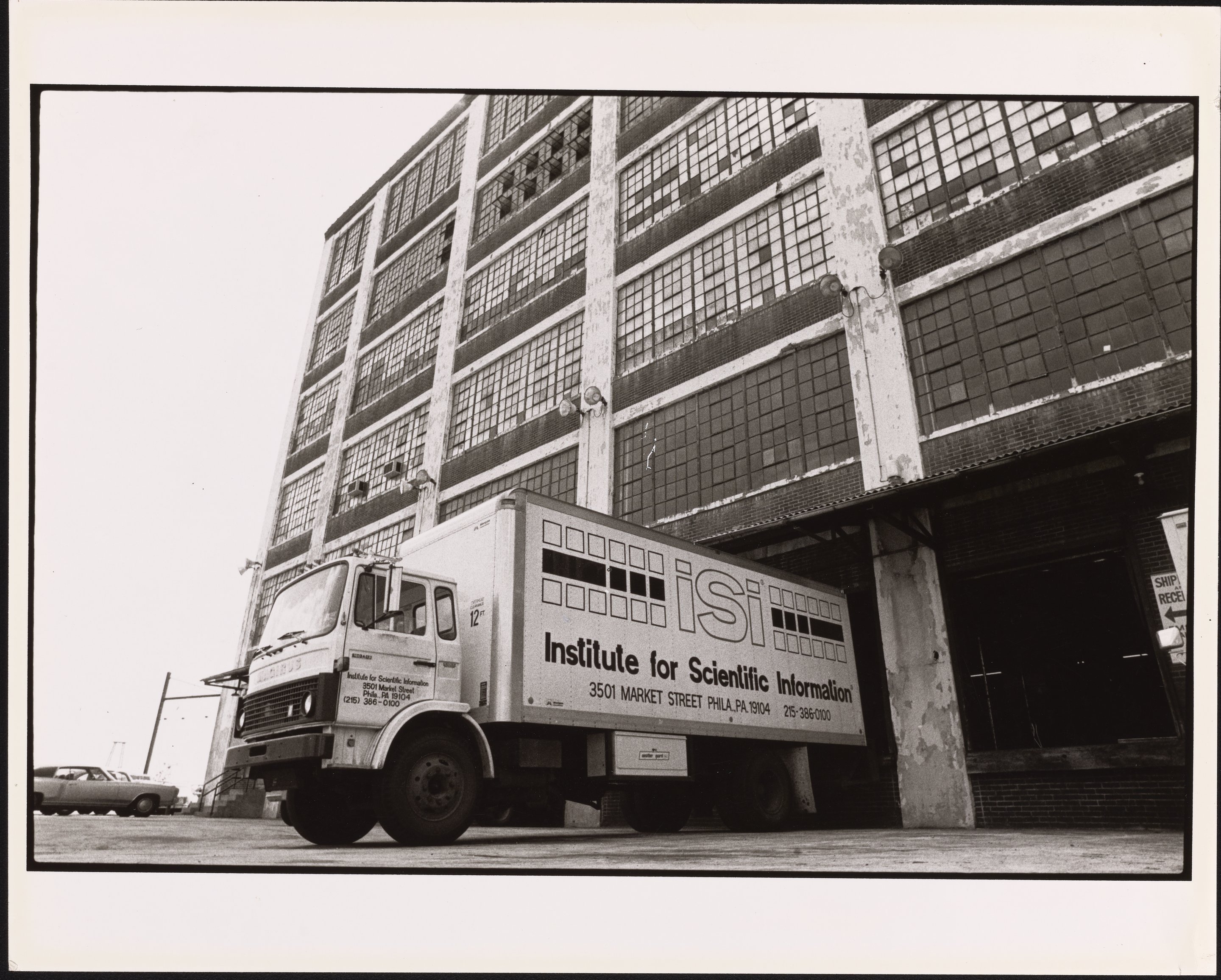 A black and white photograph depicting a carrier truck backing into an Institute for Scientific Information (ISI) warehouse. The ISI was an academic publishing service, founded by Eugene Garfield (1925-2017) in Philadelphia in 1956. ISI offered scientometric and bibliographic database services and specialized in citation indexing and analysis.