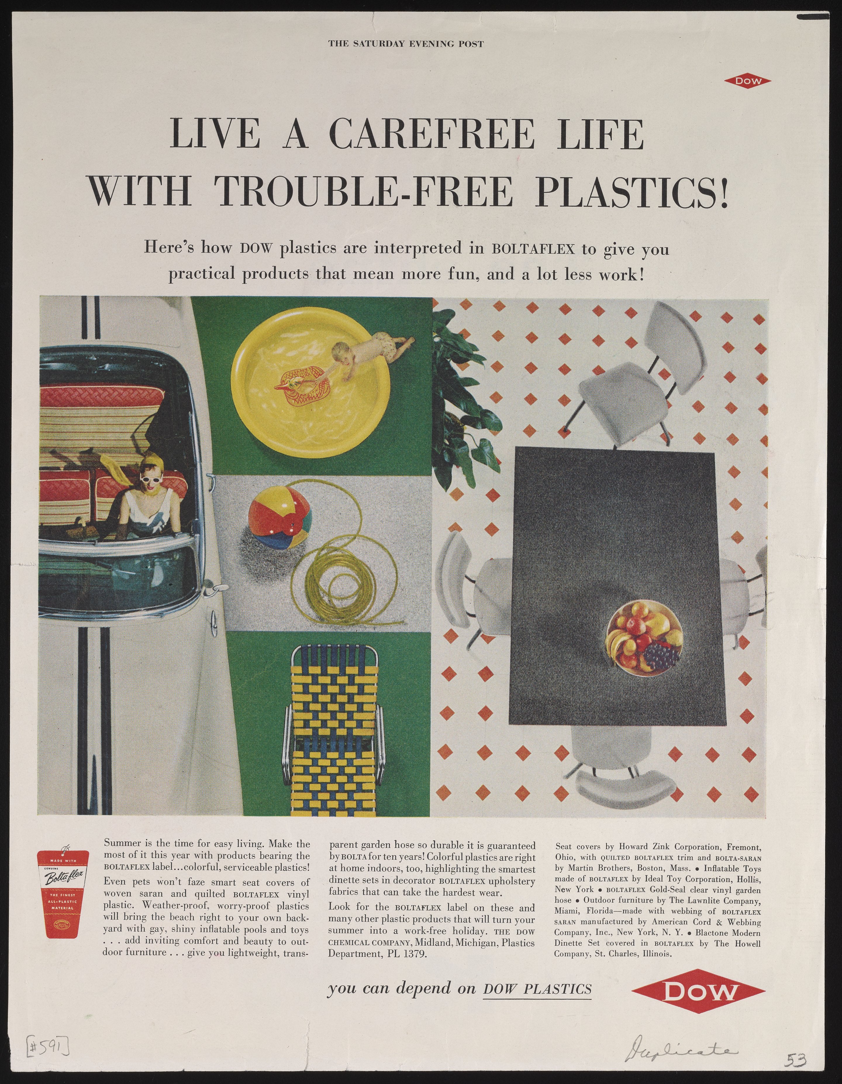 Dow Chemical Company. “Live a Carefree Life with Trouble-Free Plastics!,” June 27, 1953. Advertisements from the Dow Chemical Historical Collection, Box 9. Science History Institute. Philadelphia. https://digital.sciencehistory.org/works/5yxlcbs.