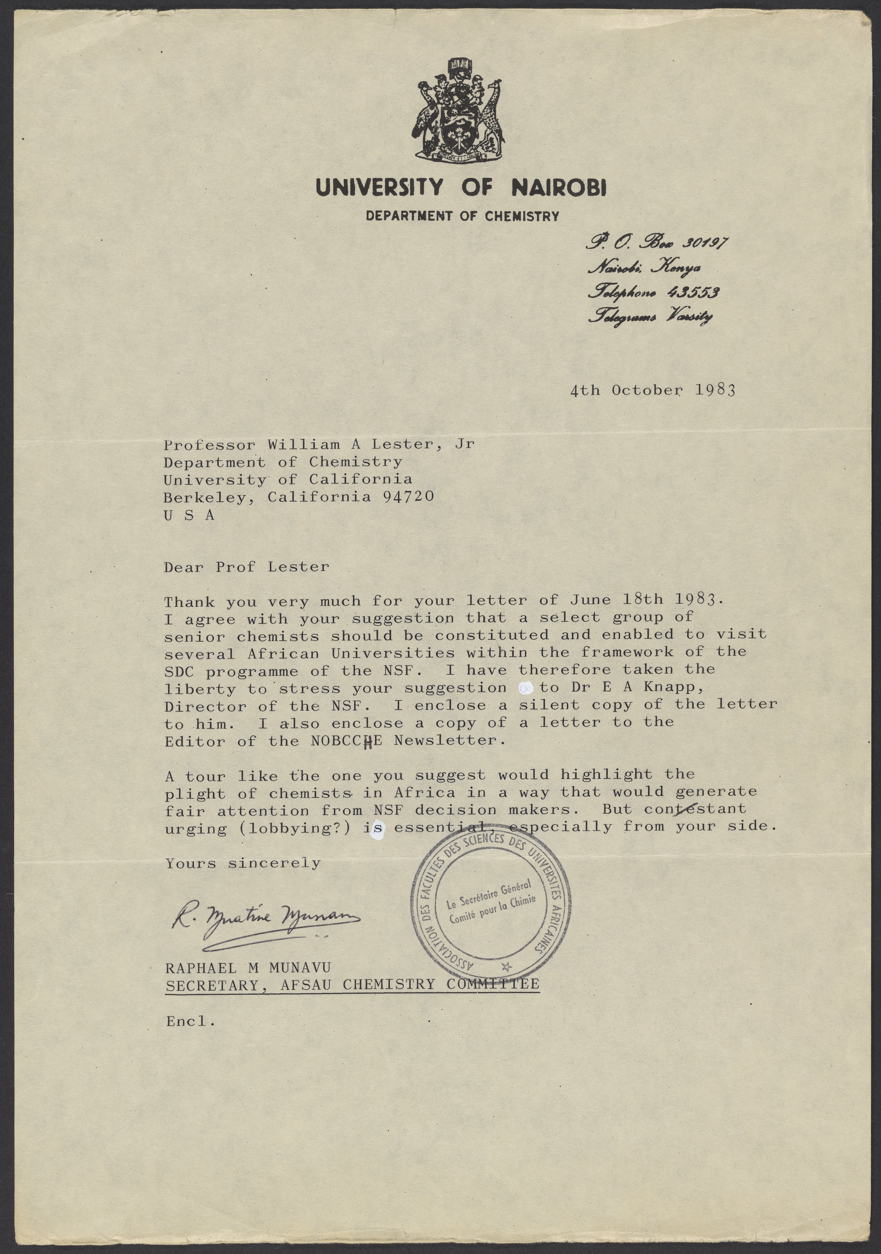 Letter from Raphael M. Munavu, the secretary for the Association of Faculties of Science of African Universities (AFSAU) Chemistry Committee, and a member of the department of chemistry at the University of Nairobi, to William A. Lester, Jr. (1937-). Munavu writes about having a select number of chemists visit African universities for the Science in Developing Countries (SDC) program, which was a program sponsored by the National Science Foundation (NSF).