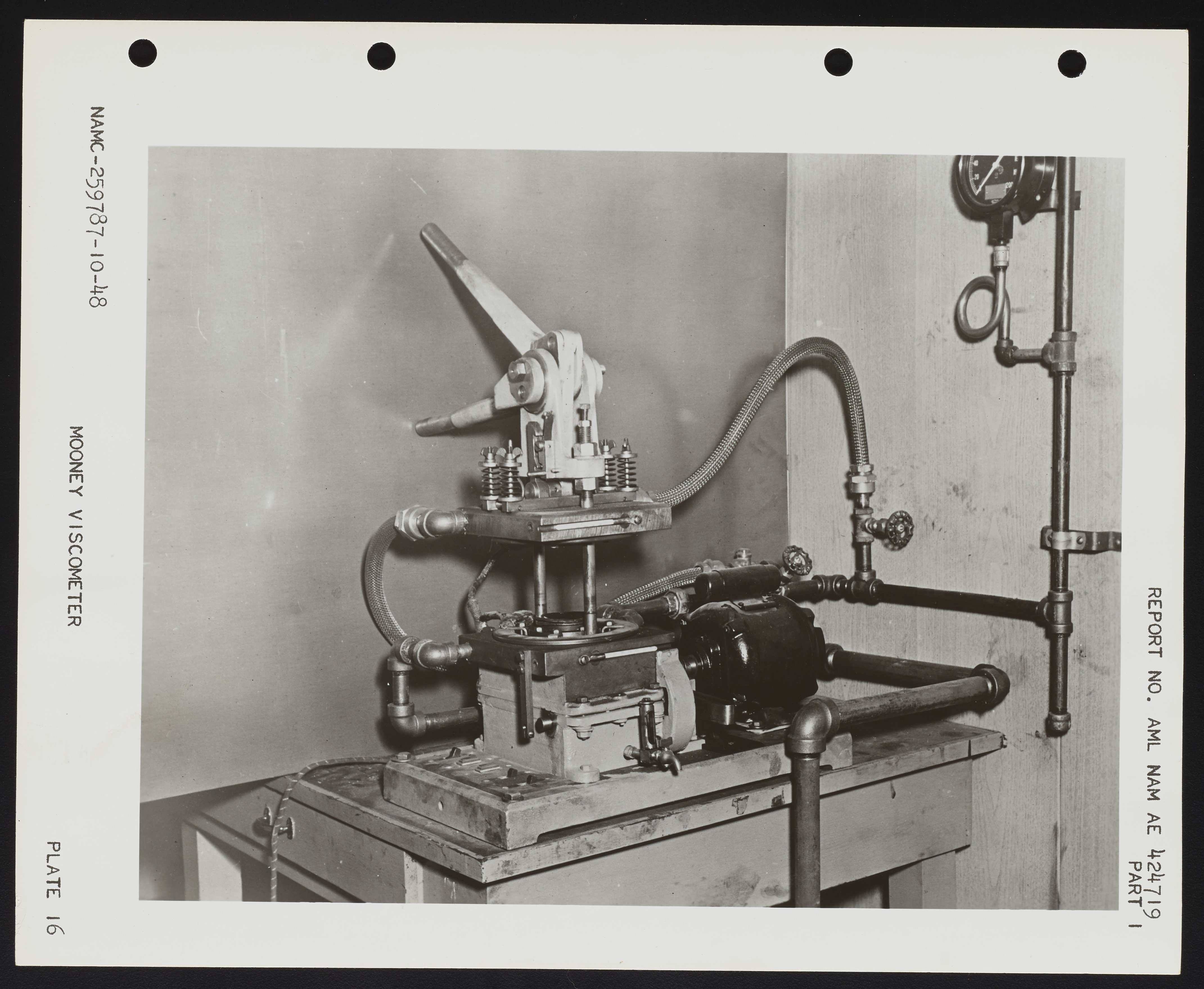 General view of the Mooney Viscometer in the Rubber Compounding and Processing Laboratory at the Naval Air Experimental Station. At the laboratory, the viscometer was used to determine the plasticity and scorch rate of uncured rubber stocks. This photograph was included in a 1949 Naval Air Experimental Station report on compounding rubber.