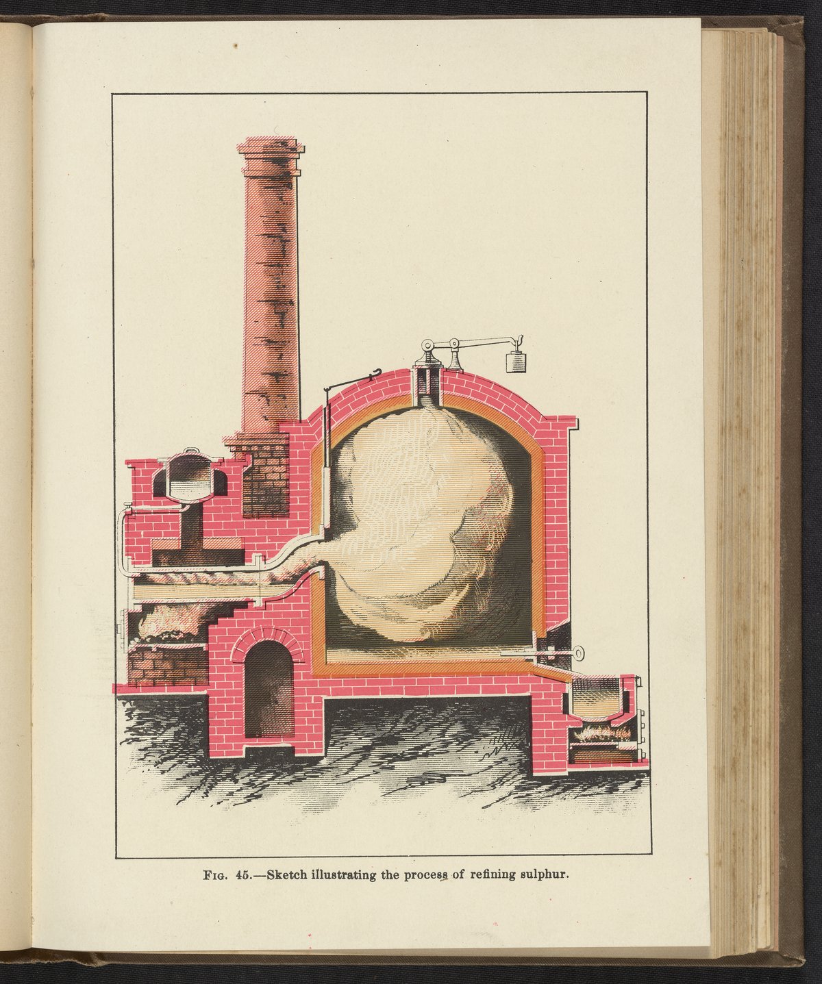 Appleton, John Howard. “Figure 45: Sketch Illustrating the Process of Refining Sulfur.” Chemistry, Developed by Facts and Principles Drawn Chiefly from the Non-Metals. Providence, Rhode Island: Providence Lithograph Company, 1884. Science History Institute. Philadelphia. https://digital.sciencehistory.org/works/63dqr4a.