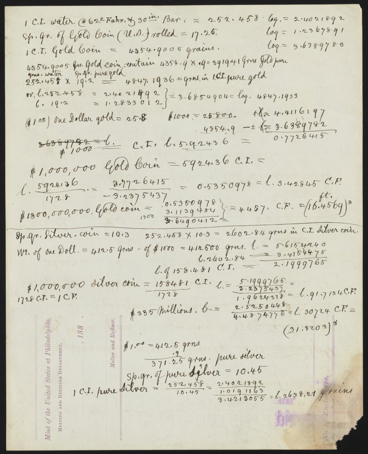 Small JPG1200 x 1484px — 248 KBLarge JPG2880 x 3561px — 1009 KBFull-sized JPG5319 x 6577px — 2.6 MBOriginal fileTIFF — 5319 x 6577px — 100 MBCalculations written on U.S. Mint letterhead, approximating the value of gold and silver coinage of the United States.
