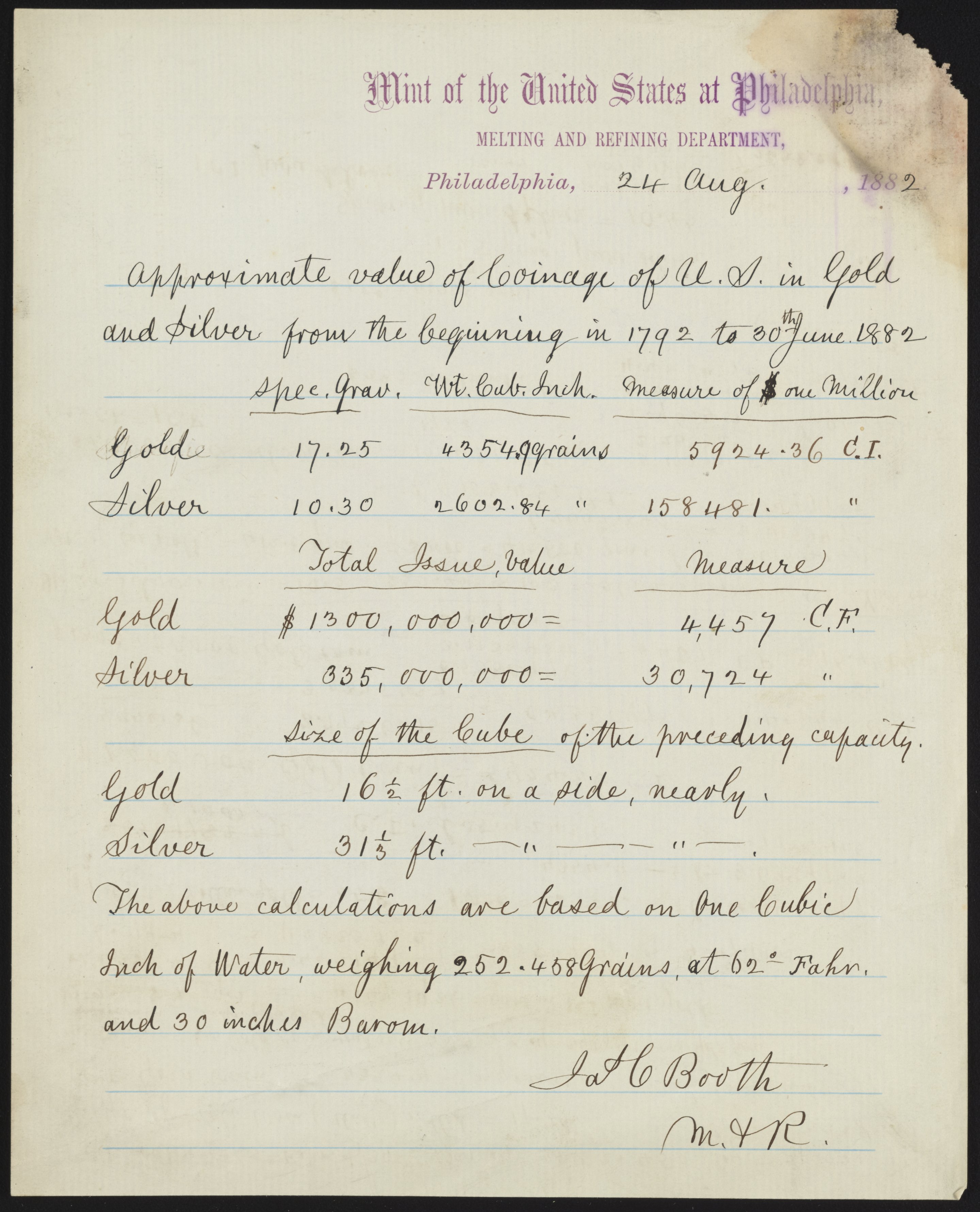 Booth, James Curtis. “Approximate Value of Coinage of U.S. in Gold and Silver from the Beginning in 1792 to 30th June, 1882,” August 24, 1882. Papers of James Curtis Booth, Box 7, Folder 7. Science History Institute. Philadelphia. https://digital.sciencehistory.org/works/6682x432g.