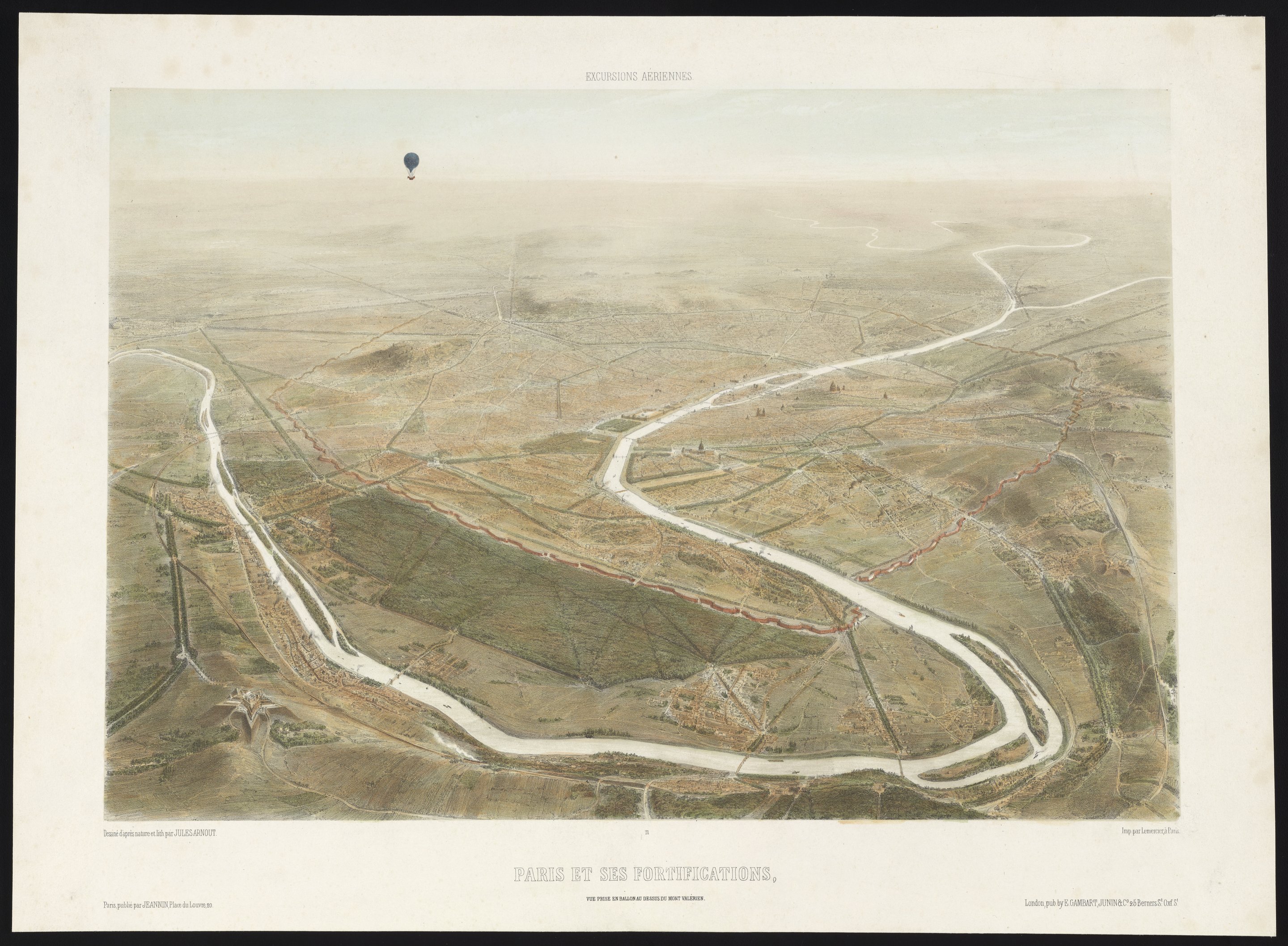 Arnout, Jules. “Paris Et Ses Fortifications, Vue Prise En Ballon Au Dessus Du Mont Valérien.” Gambart, Junin & Co. (London), circa 1846. Science History Institute. Philadelphia. https://digital.sciencehistory.org/works/6682x476j.