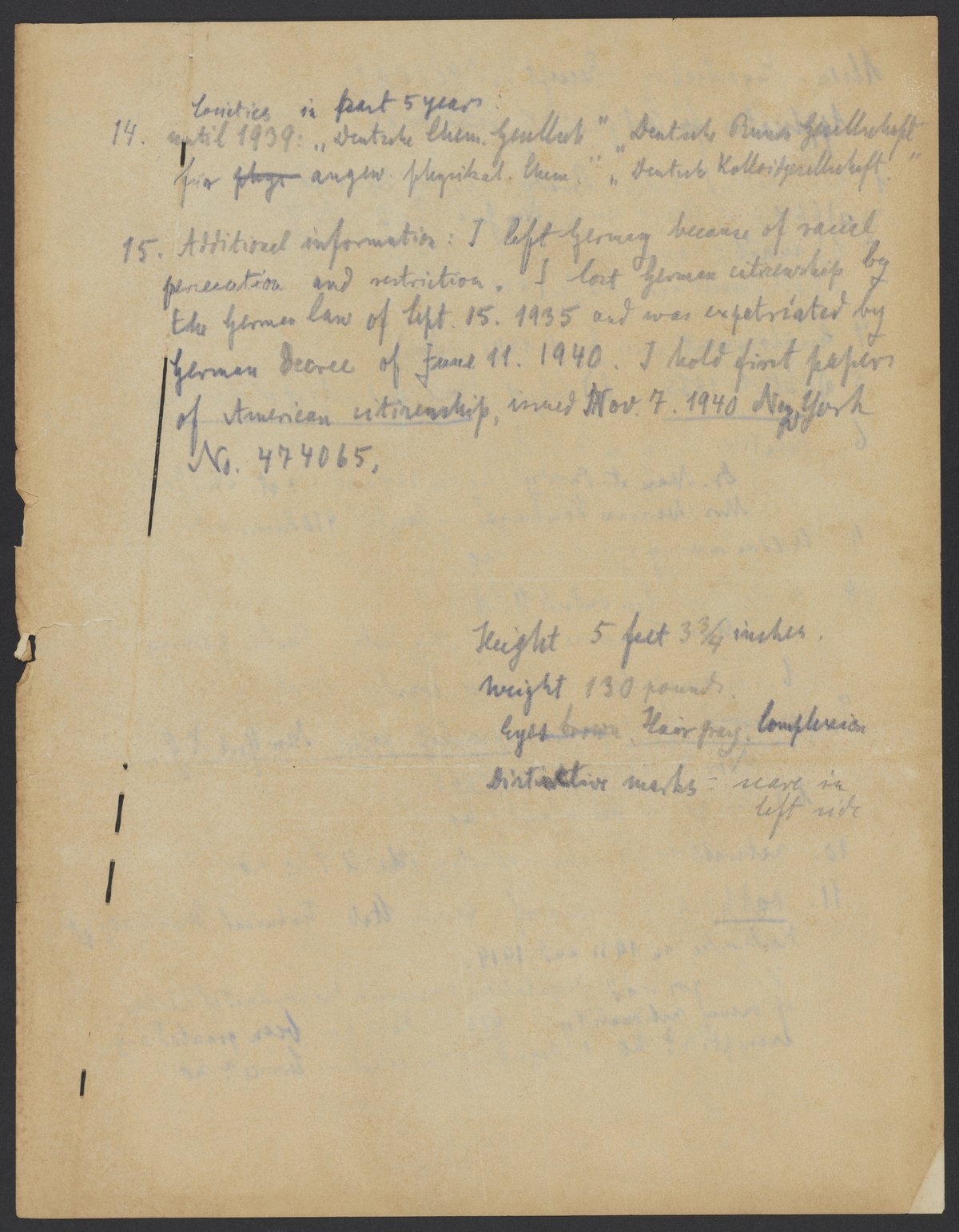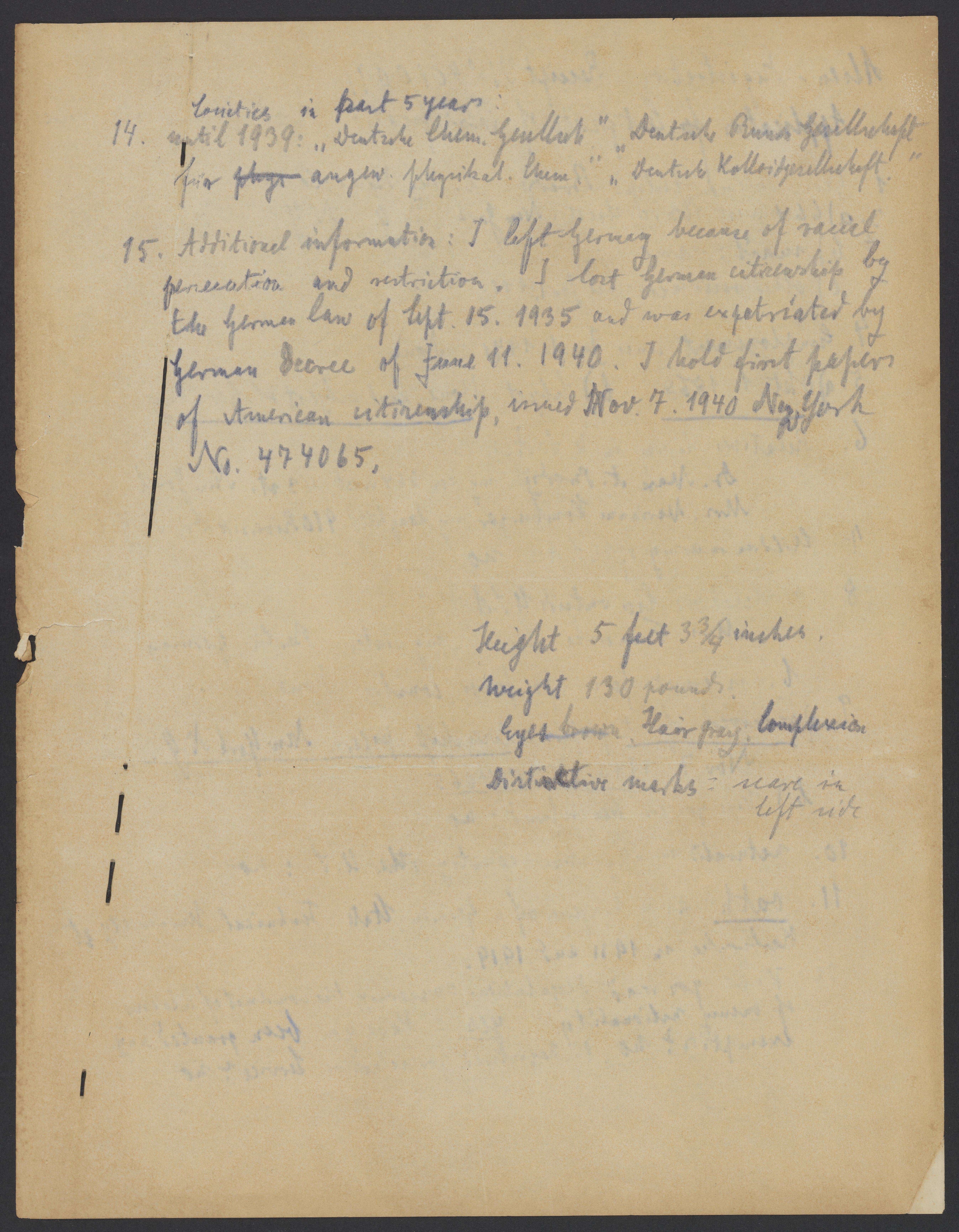 Small JPG1200 x 1540px — 267 KBLarge JPG2880 x 3697px — 1.7 MBFull-sized JPG5363 x 6884px — 5.7 MBOriginal fileTIFF — 5363 x 6884px — 106 MBHandwritten copy of Georg Bredig's (1868-1944) United States Application for Certificate of Identification. Includes identifying information about Bredig such as his height, weight, and current address, in addition to a written statement detailing his cause for leaving Germany.