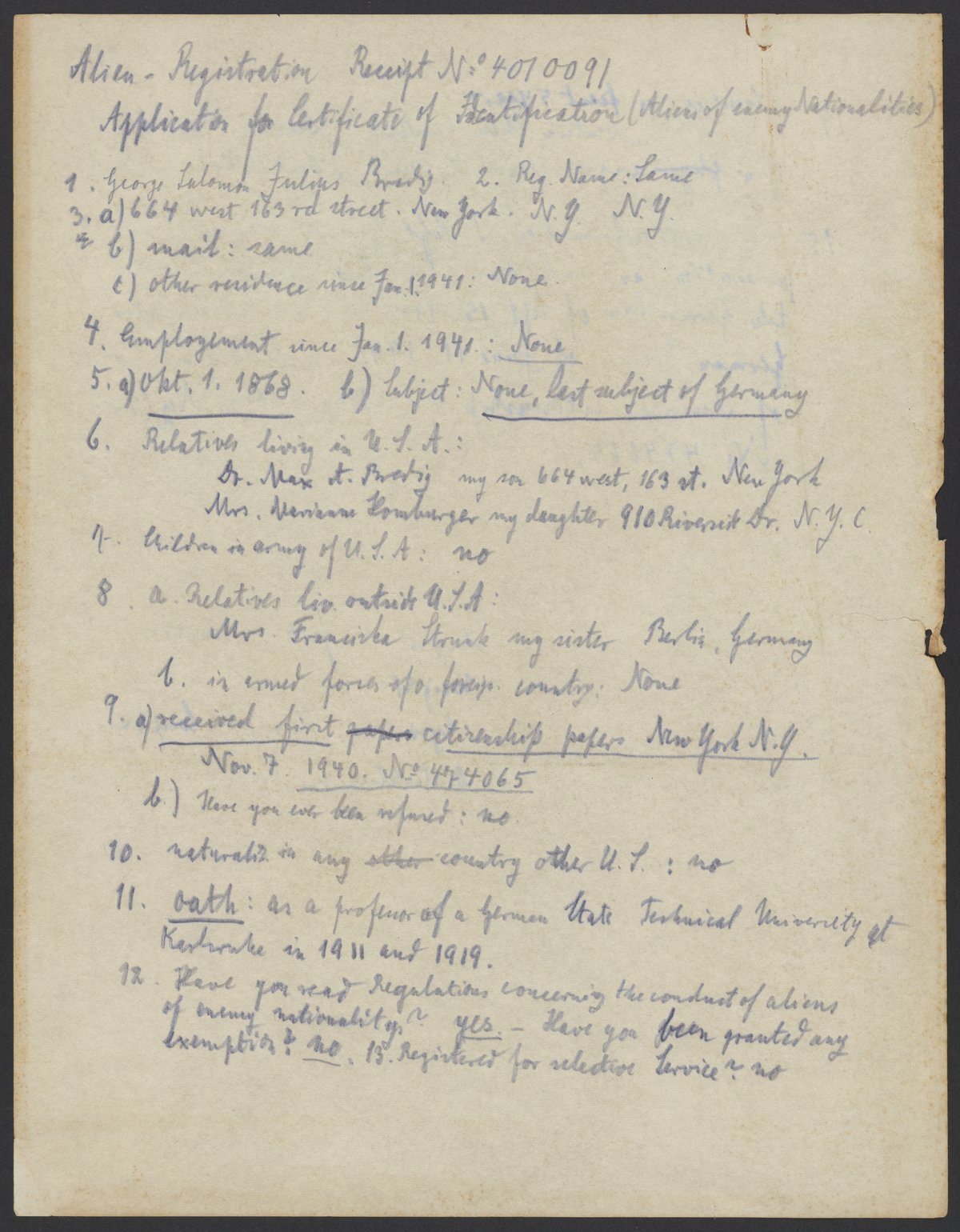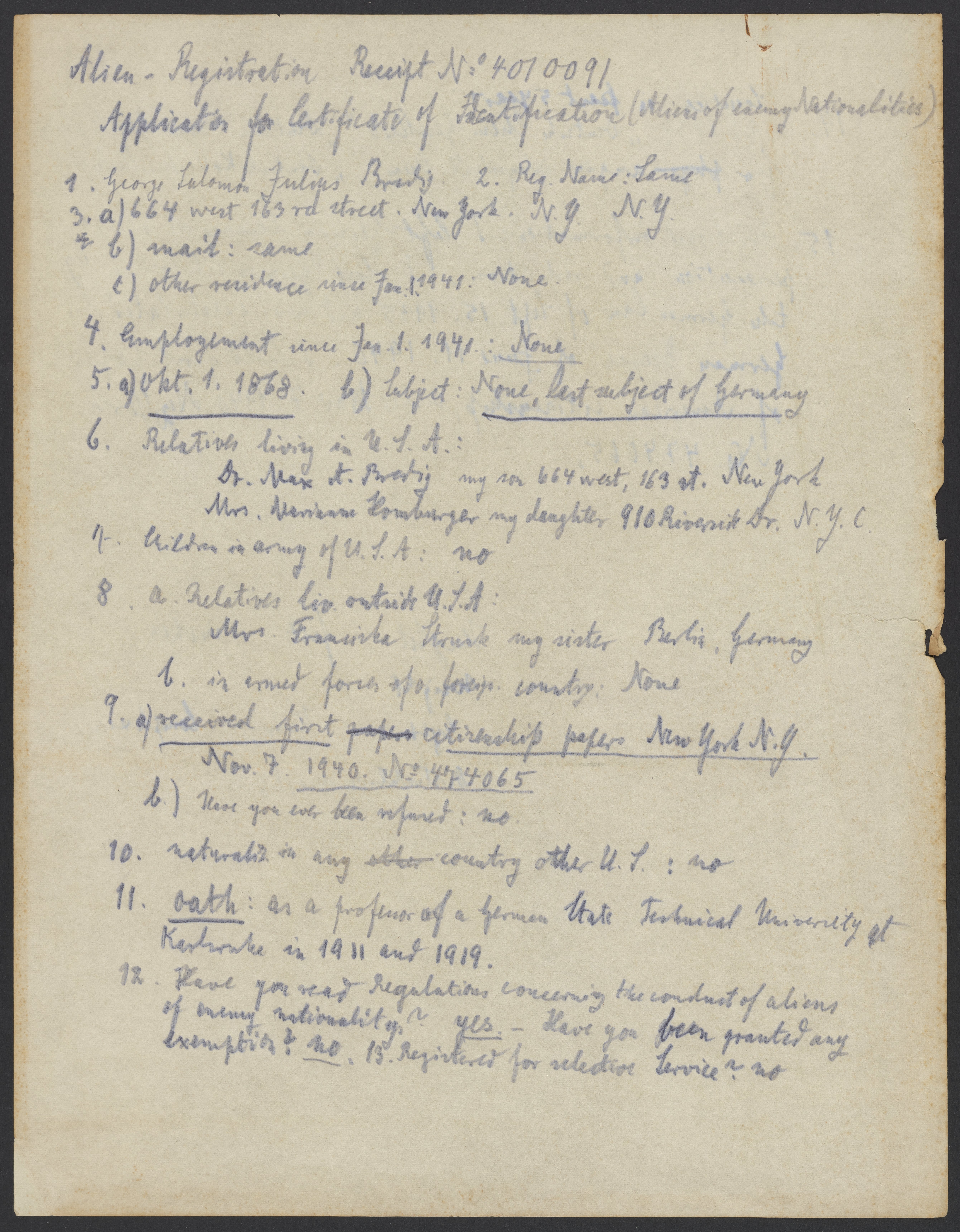 Bredig, Georg. “Application for Certificate of Identification (Aliens of Enemy Nationalities),” February 18, 1942. Papers of Georg and Max Bredig, Box 3, Folder 8. Science History Institute. Philadelphia. https://digital.sciencehistory.org/works/682lxbb.