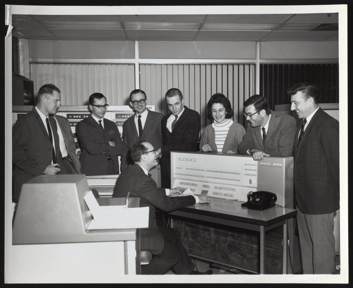 Group photograph of unidentified Perkin-Elmer Corporation employees gathered around a Scientific Data Systems (SDS) 9300 unit. Founded by Max Palevsky and Robert Beck in September 1961, Scientific Data Systems manufactured computers capable of large-scale scientific computations. Notably, the company was an early adopter of integrated circuits in computer design and the first to employ silicon transistors.