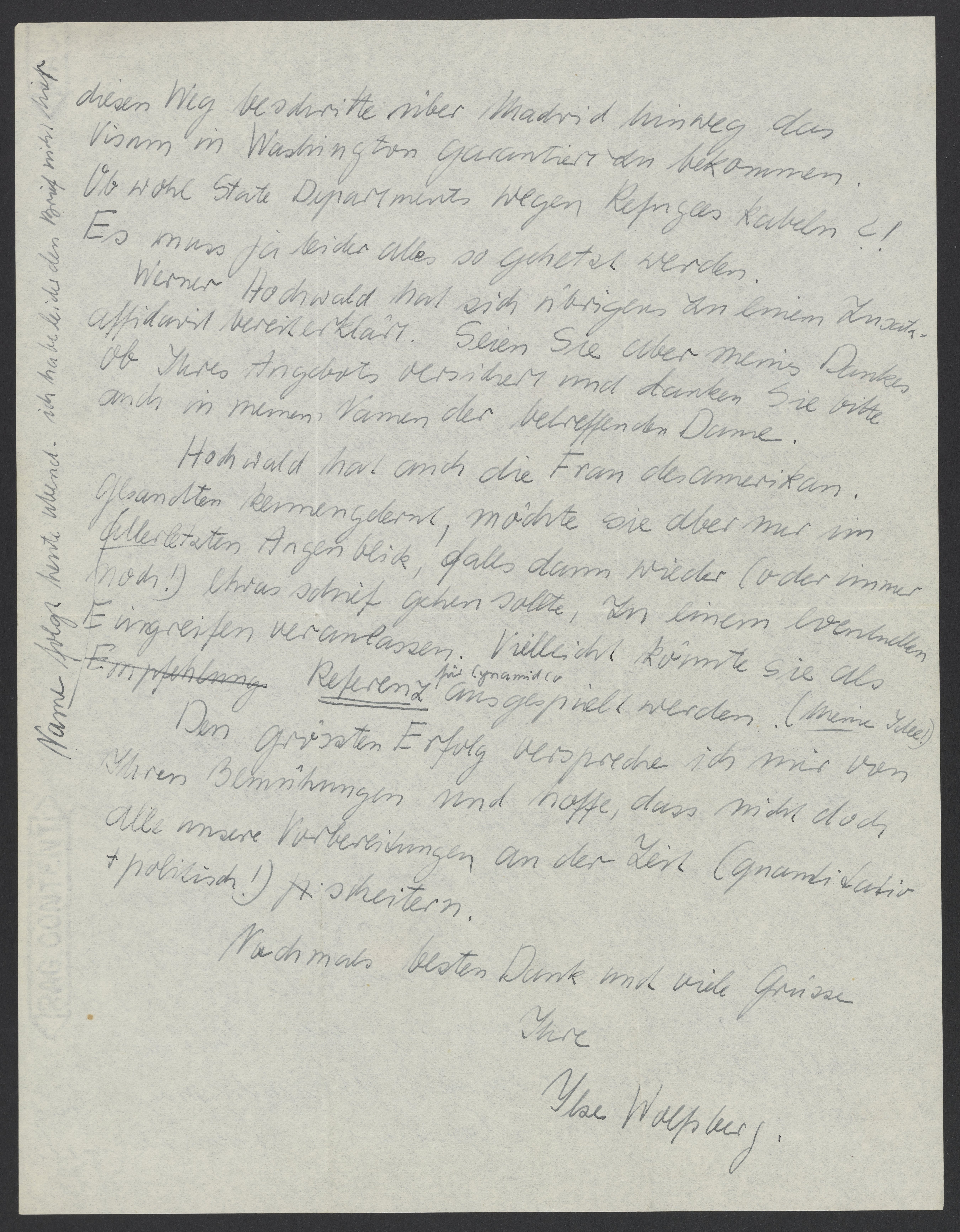 diesen Weg beschritte über Madrid hinweg das Visum in Washington zu bekommen. Obwohl State Department wegen Refugees kabeln?! Es muss ja leider alles so gehetzt werden.
