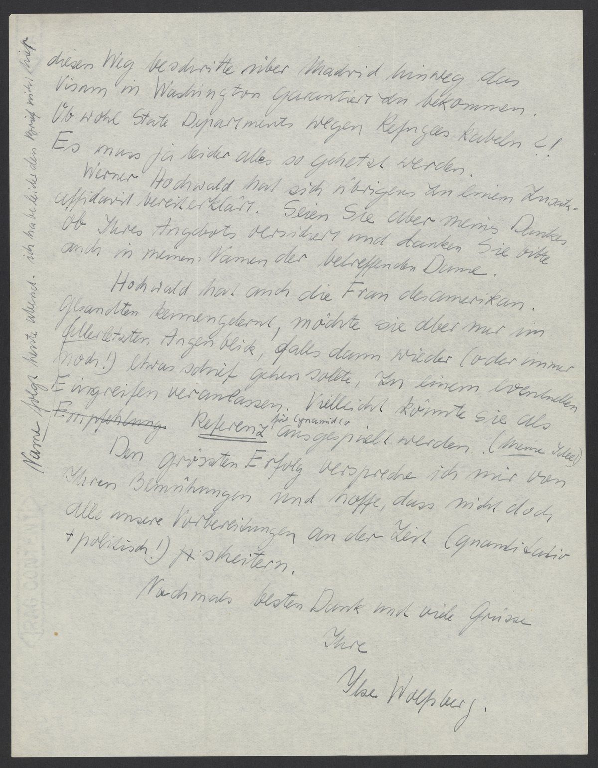 Thank you very much for your extensive efforts to help Hochwald. As a result, I hope that the consul in Madrid will reconsider his decision. In addition to a nice letter of recommendation from Professor Nord, I have received a telegram from Professor Gortner on behalf of the local chemists, which emphasizes that experts like Hochwald are needed. Moreover, an acquaintance of mine sent documents to Senator Ball. When Senator Bell was here the other day, he telephoned and said that he would forward them to the State Department so that the visa from Washington could be arranged. If he actually gets around to it is another matter, especially since he is likely very busy at the moment. Another question came to mind.