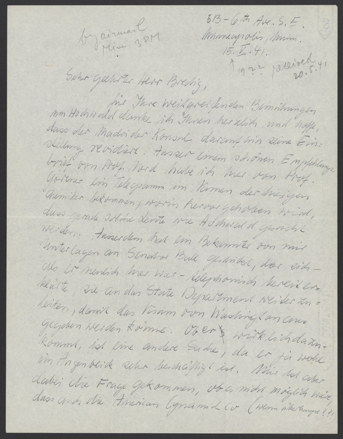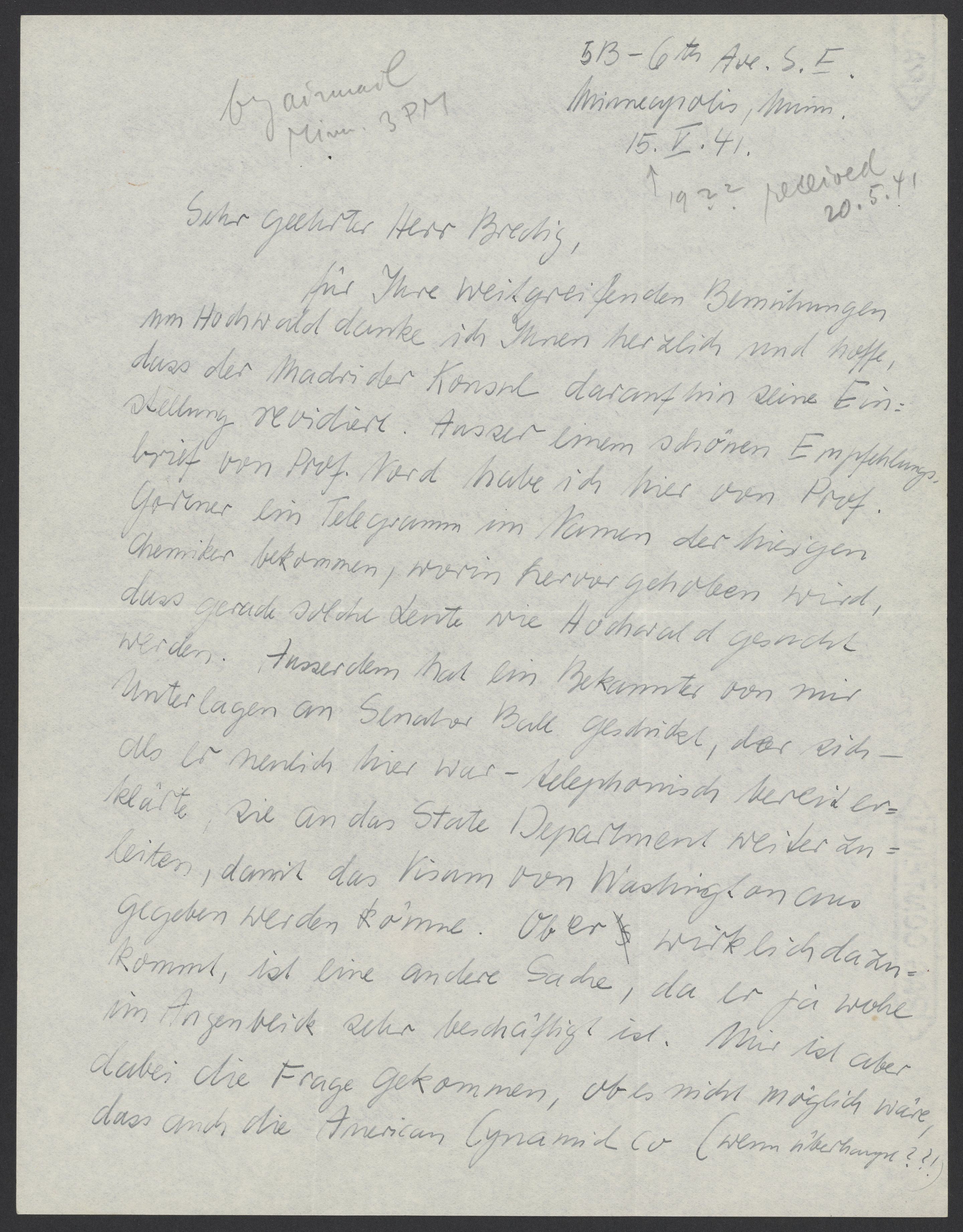 [Max Bredig’s hand: received on May 20, 1941 at 7:22 PM]