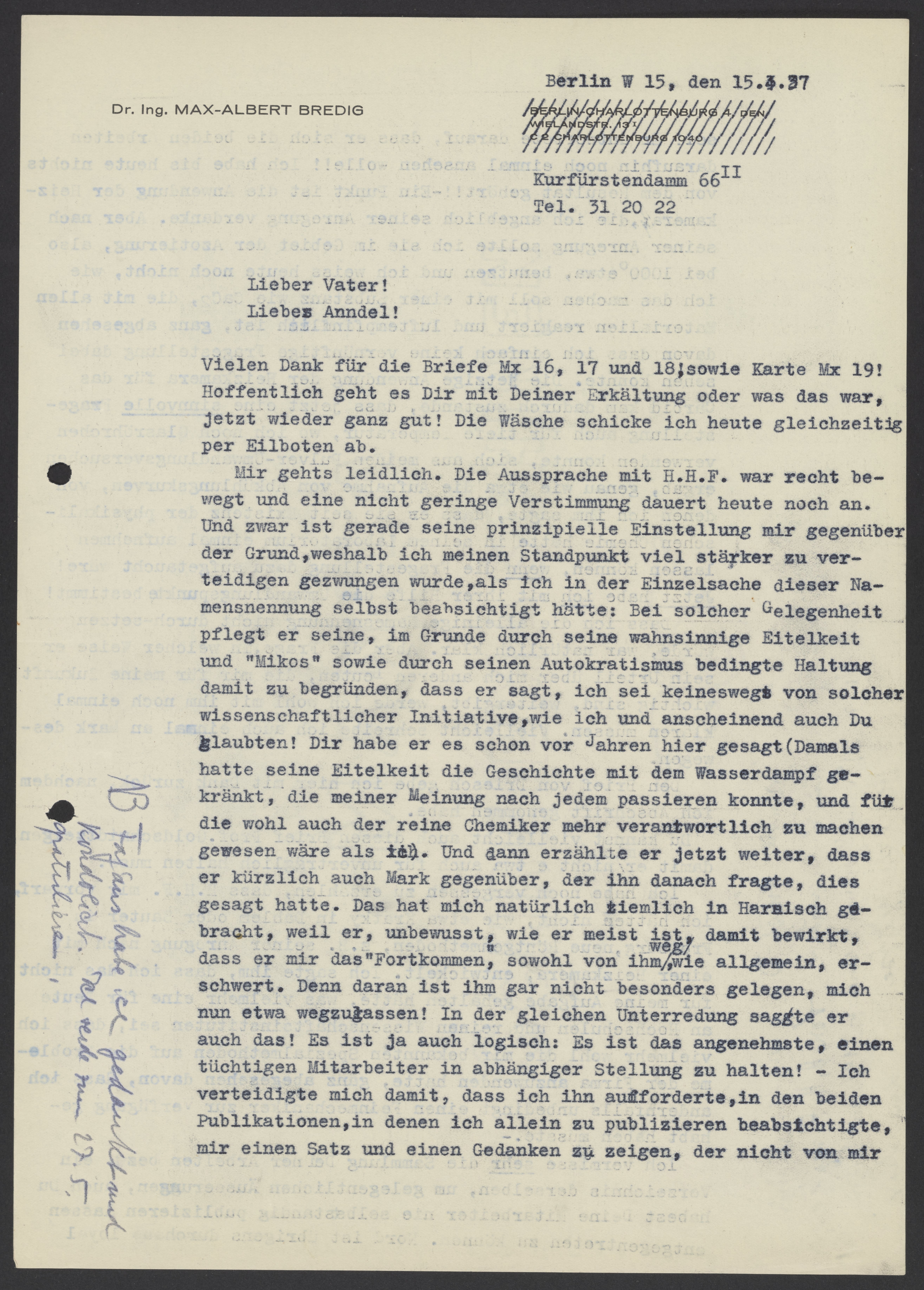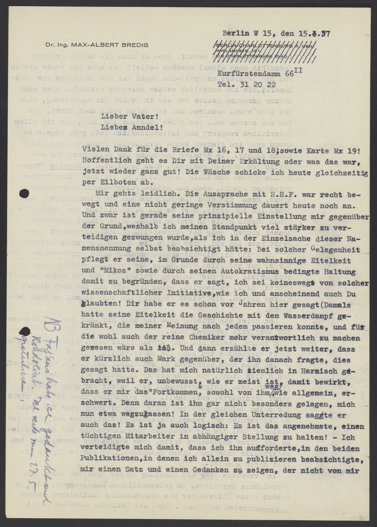Letter from Max Bredig to Georg Bredig and Marianne Homburger, April 15, 1937