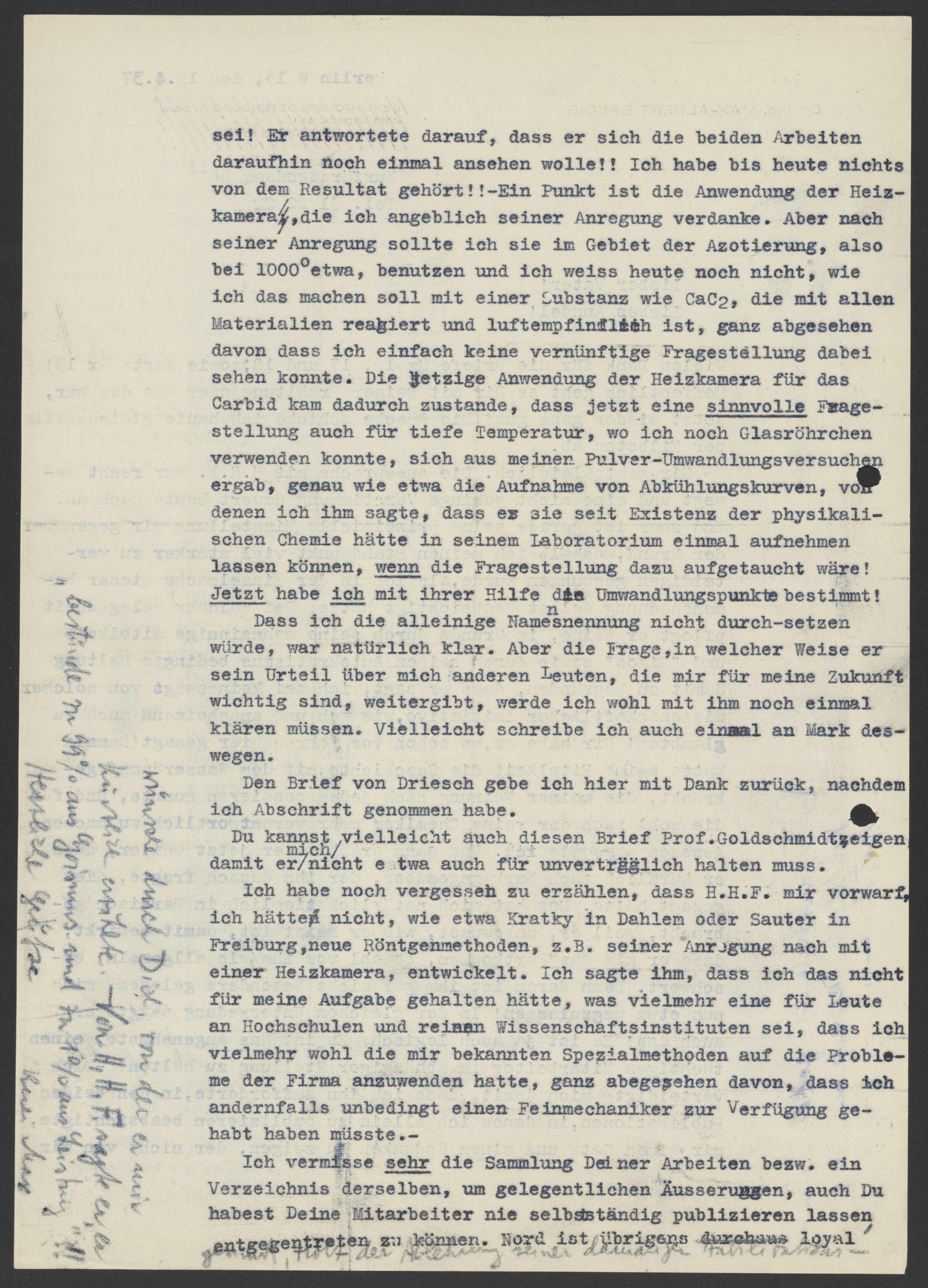 I forgot to mention, that H.H.F criticized me for not developing new X-ray methods with the heat camera like Kratky in Dahlem or Sauter in Freiburg. I told him that I didn’t think it was my job, especially since there are scholars at universities and scientific institutes better suited for this task. I would prefer to concentrate on the company’s research using familiar methods. Besides, I would have needed a specialized engineer to help me.
