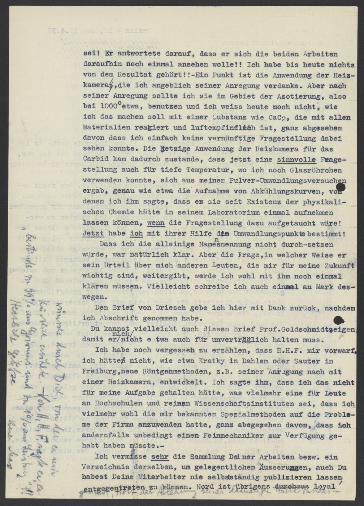 It was clear that I would not receive sole authorship. However, I will have to talk to him about the way he judges me around other people who are important for my future. Perhaps I will write to Mark about this. Thank you for the letter from Mr. Driesch, which I’m returning after making a copy. You can also show this letter to Professor Goldschmidt so that he doesn’t think I’m irresponsible.