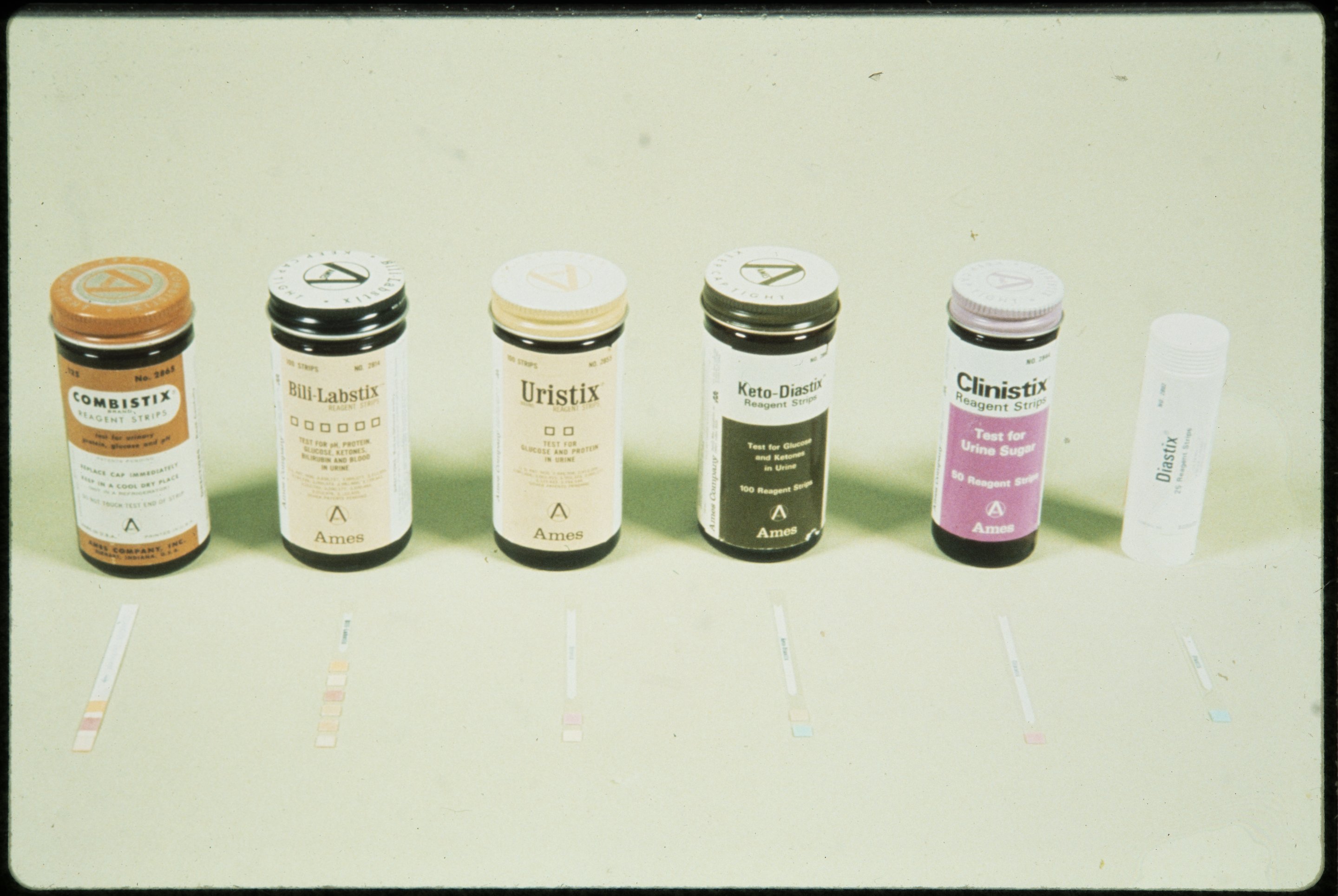 General view of assorted reagent strips for urine sugar testing manufactured by the Ames Company.