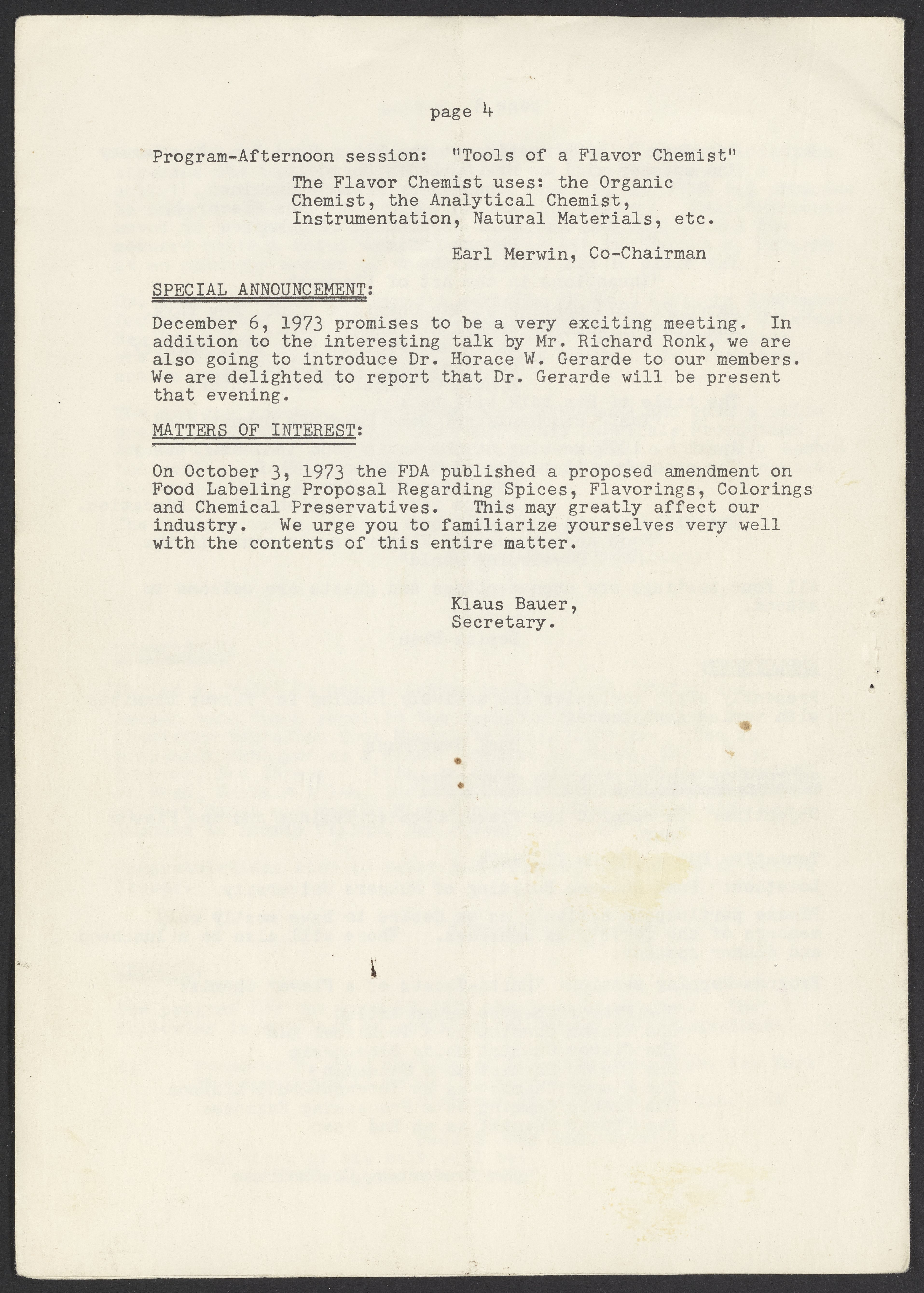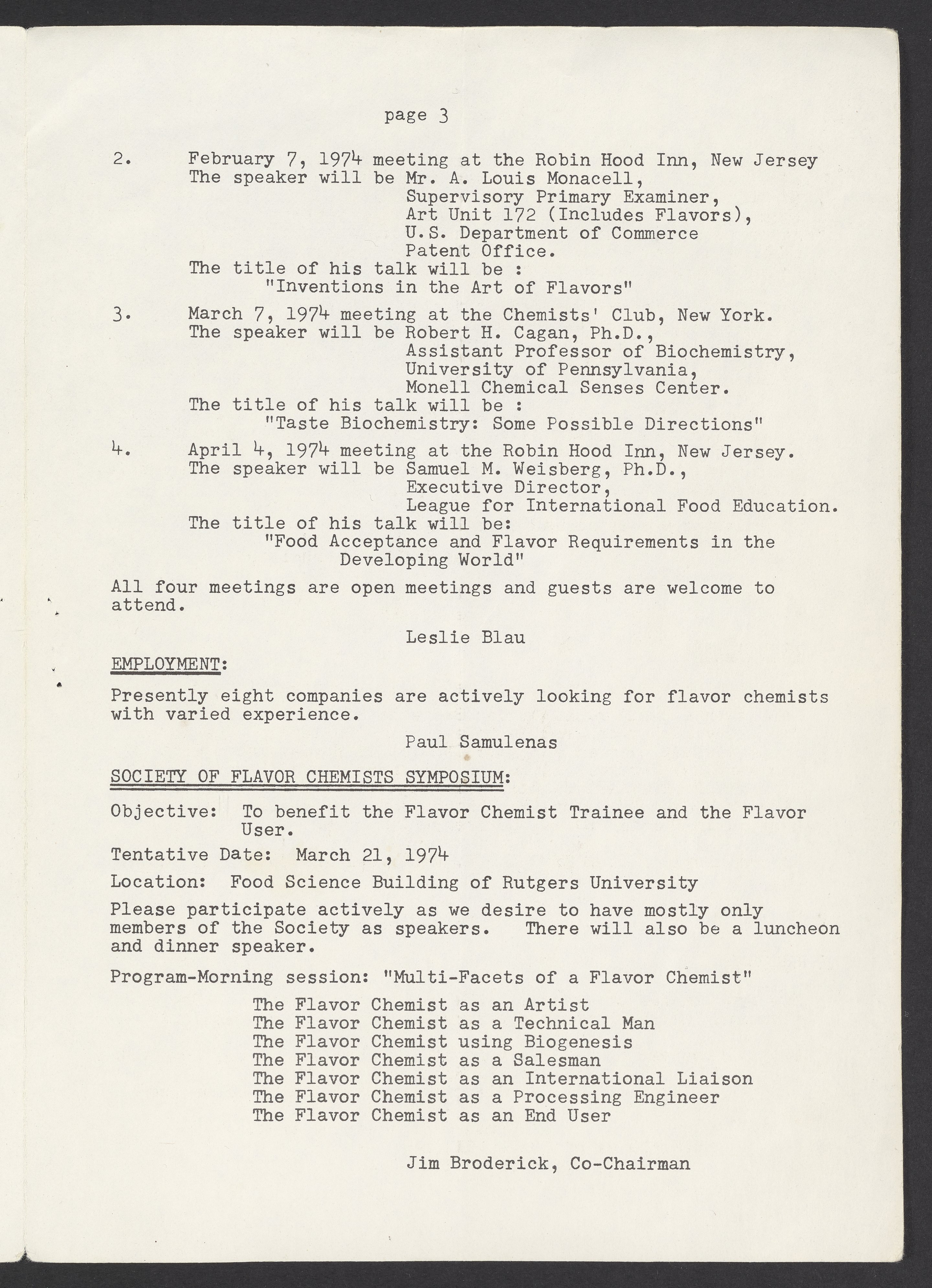 Society of Flavor Chemists. “Society of Flavor Chemists Newsletter, October 1973,” October 1973. Society of Flavor Chemists Newsletters and Certificate of Incorporation, Box 1, Folder 1. Science History Institute. Philadelphia. https://digital.sciencehistory.org/works/6fkfuu7.