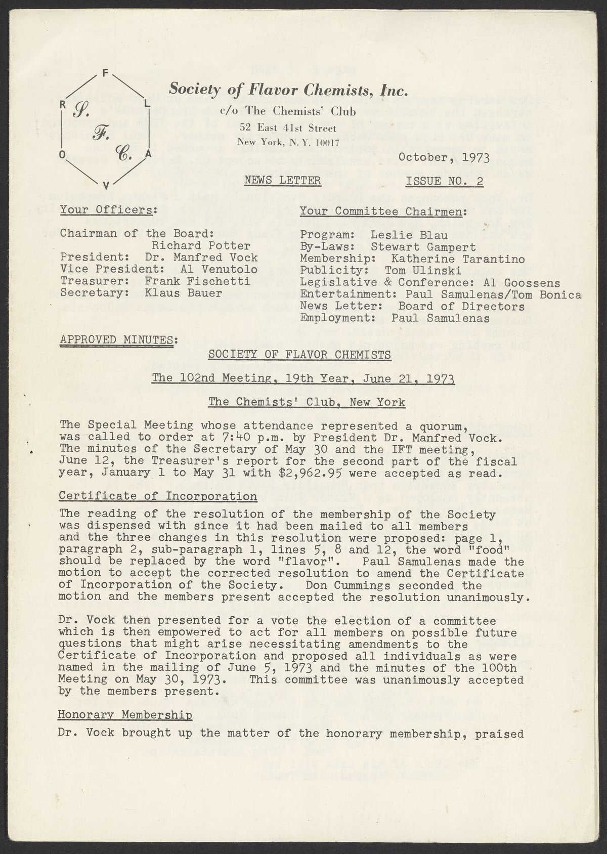 Society of Flavor Chemists. “Society of Flavor Chemists Newsletter, October 1973,” October 1973. Society of Flavor Chemists Newsletters and Certificate of Incorporation, Box 1, Folder 1. Science History Institute. Philadelphia. https://digital.sciencehistory.org/works/6fkfuu7.