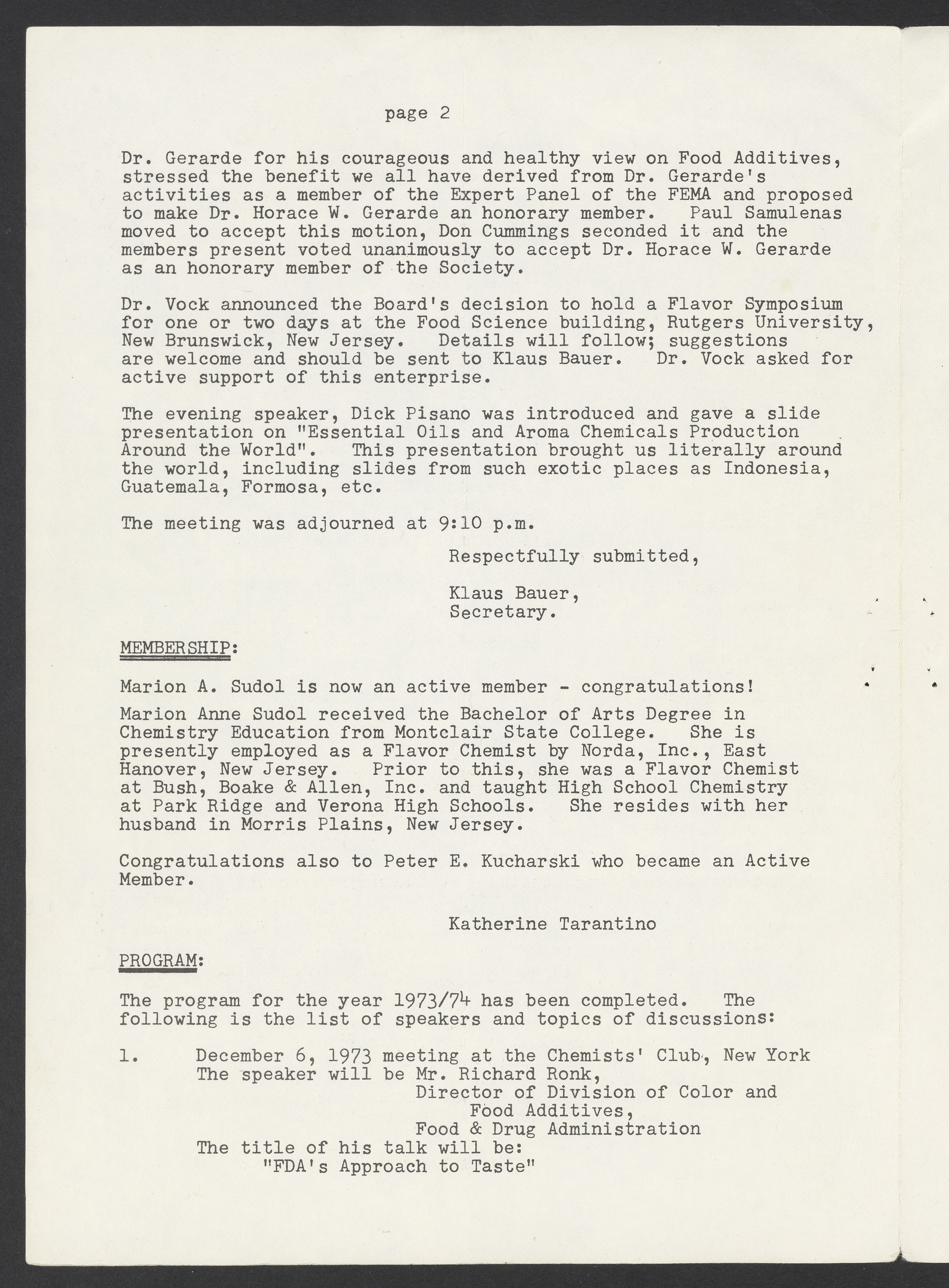 Society of Flavor Chemists. “Society of Flavor Chemists Newsletter, October 1973,” October 1973. Society of Flavor Chemists Newsletters and Certificate of Incorporation, Box 1, Folder 1. Science History Institute. Philadelphia. https://digital.sciencehistory.org/works/6fkfuu7.