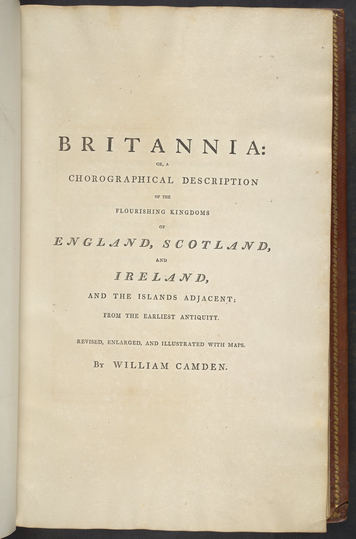 The first edition of Britannia consisted of a small octavo. Throughout his lifetime, Camden added to the work. After his death, translators and naturalists contributed their own additions; this set of volumes was published well after Camden's death and contains additions from an unknown number of translators, naturalists, and scholars.