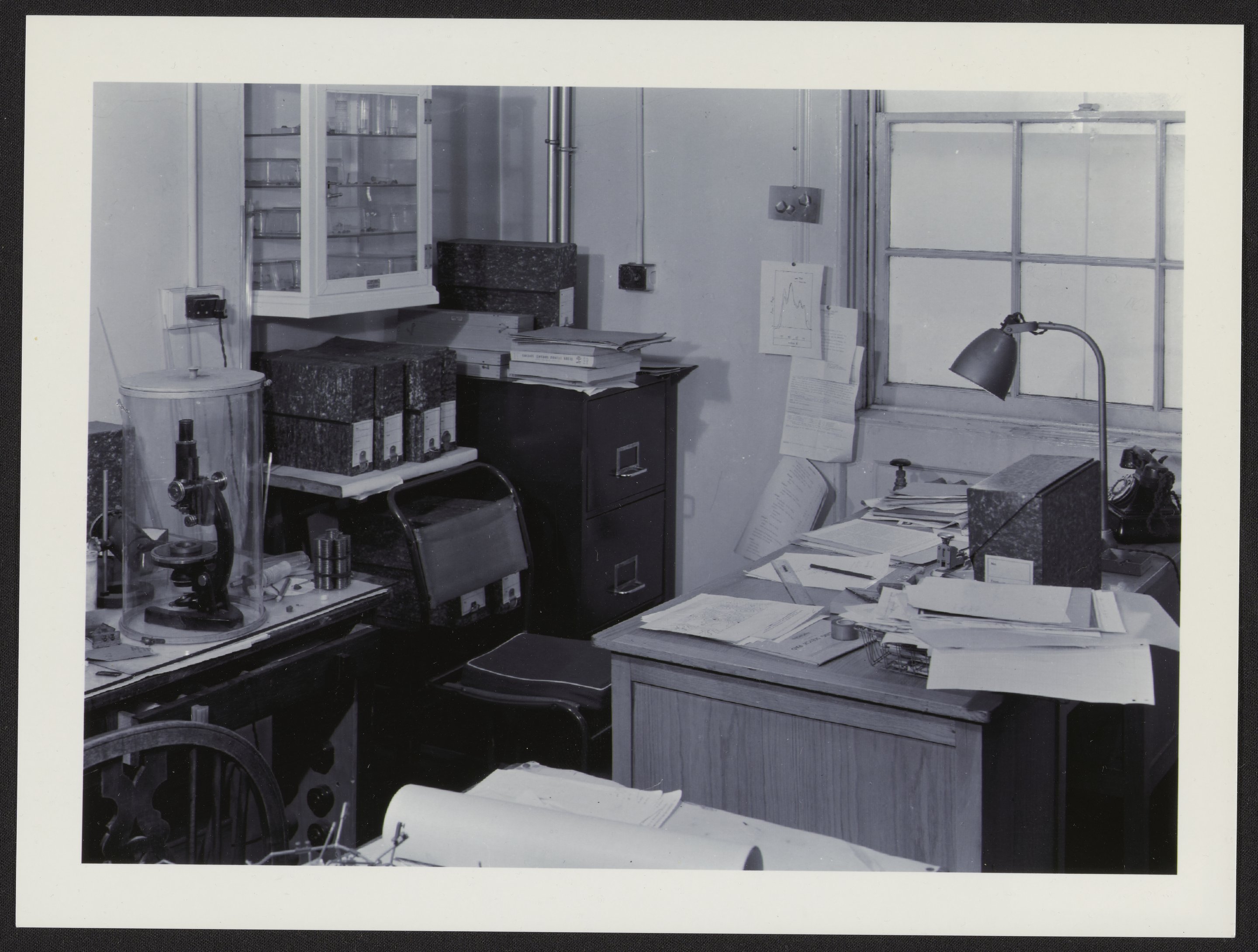 Black and white photograph of Rosalind Franklin's (1920–1958) laboratory at Birkbeck College, taken shortly after her death.