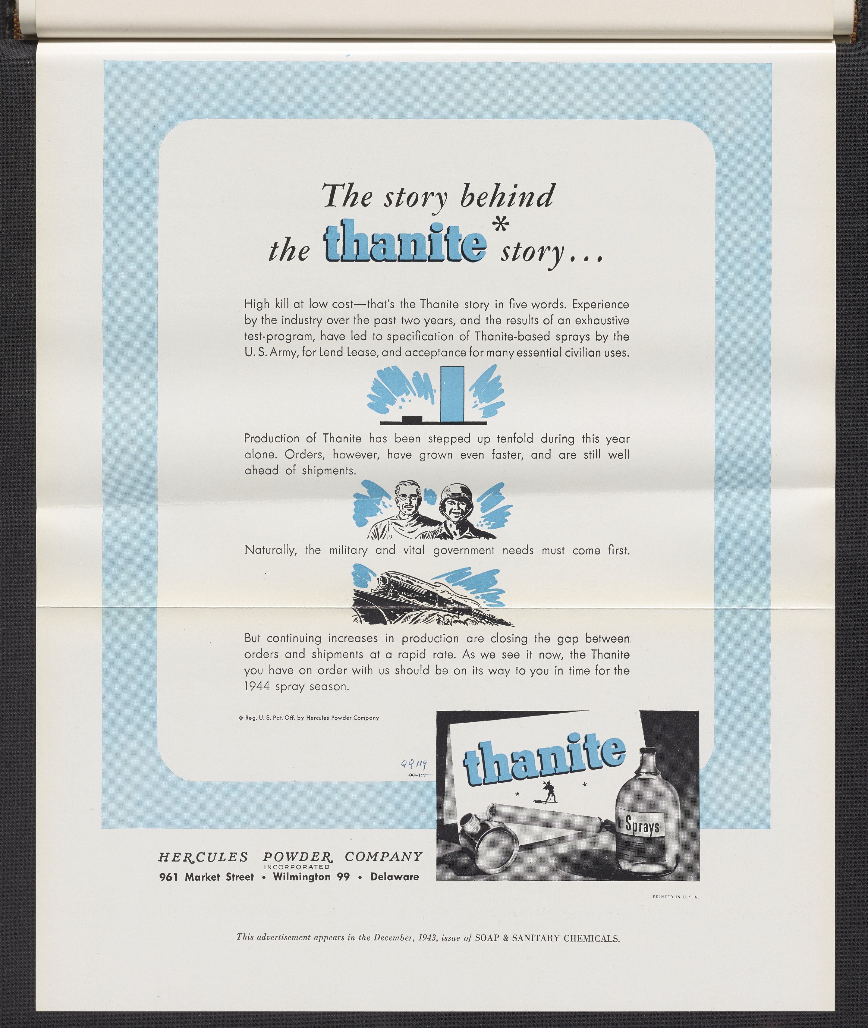 Hercules Incorporated. “The Story Behind the Thanite Story...” 1943 Hercules Advertisements, 1943. Records of Hercules Incorporated, Volume 1943. Science History Institute. Philadelphia. https://digital.sciencehistory.org/works/6h440t06t.