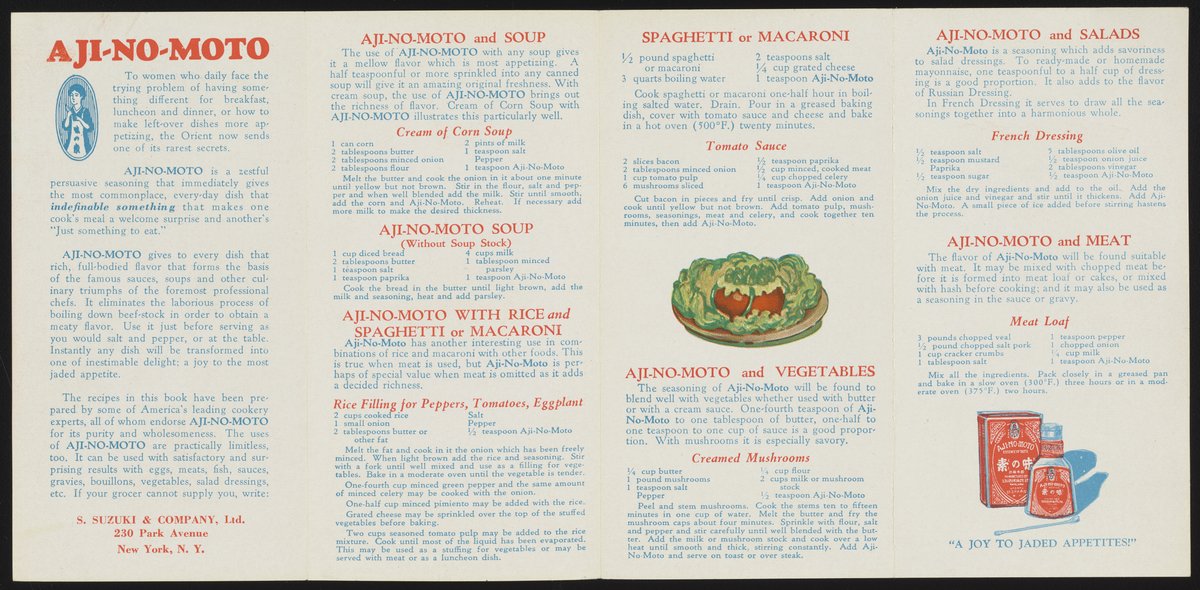 Promotional pamphlet Aji-No-Moto, a mono sodium glutamate (MSG) food additive product manufactured by S. Suzuki & Co., Ltd. Designed to market Aji-No-Moto to housewives, the pamphlet includes recipes for a variety of dishes and sauces, including soup, spaghetti, and omelets, purportedly enhanced by the addition of Aji-No-Moto.