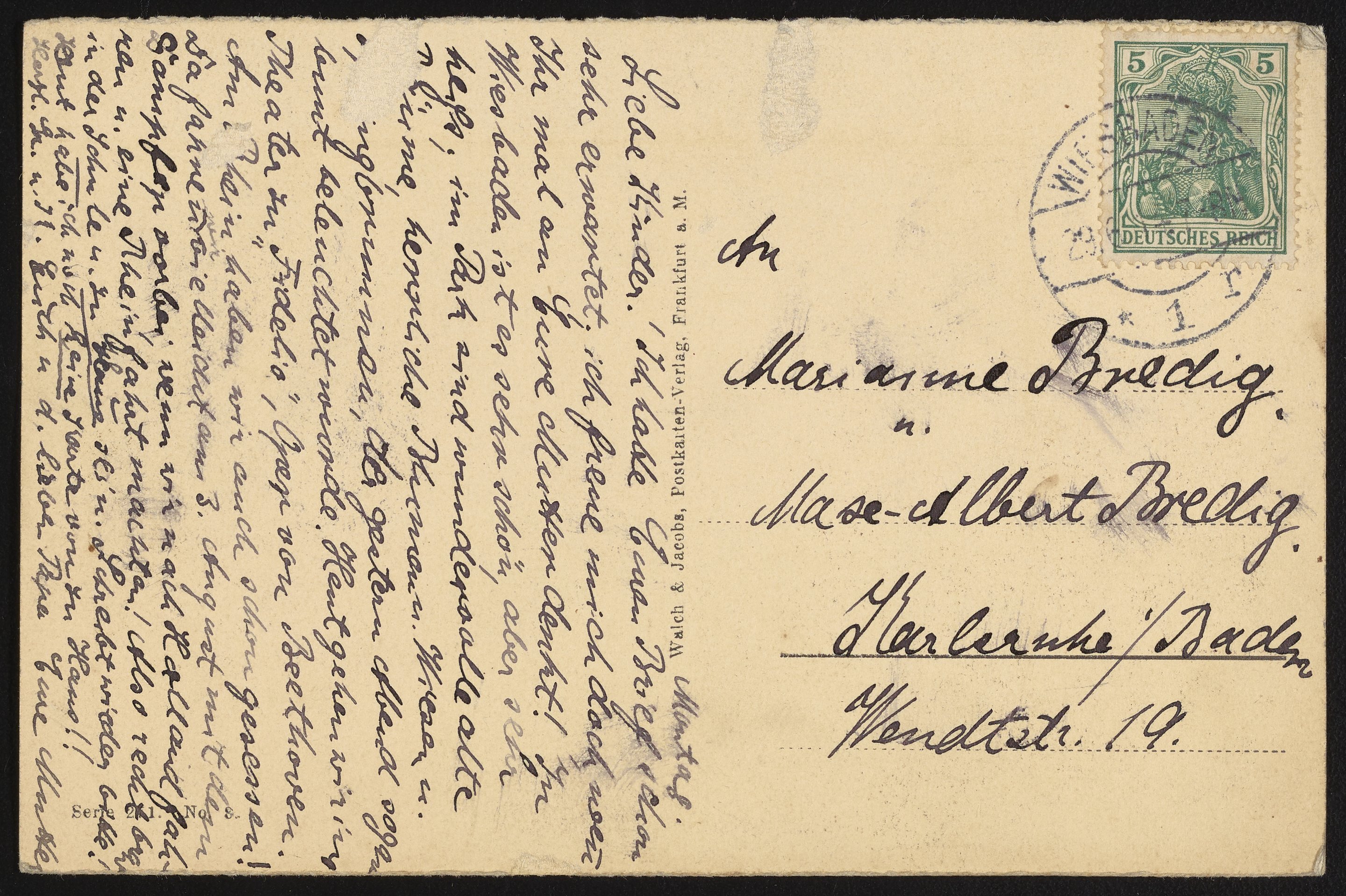 Small JPG1200 x 799px — 201 KBLarge JPG2880 x 1918px — 1.1 MBFull-sized JPG3367 x 2242px — 1.5 MBOriginal fileTIFF — 3367 x 2242px — 21.7 MBPostcard from Wiesbaden, Germany from Rosa Bredig née Fraenkel (1877-1933) and Georg Bredig (1868-1944) to their children Marianne Homburger née Bredig (1903-1987) and Max Albert Bredig (1902-1977).