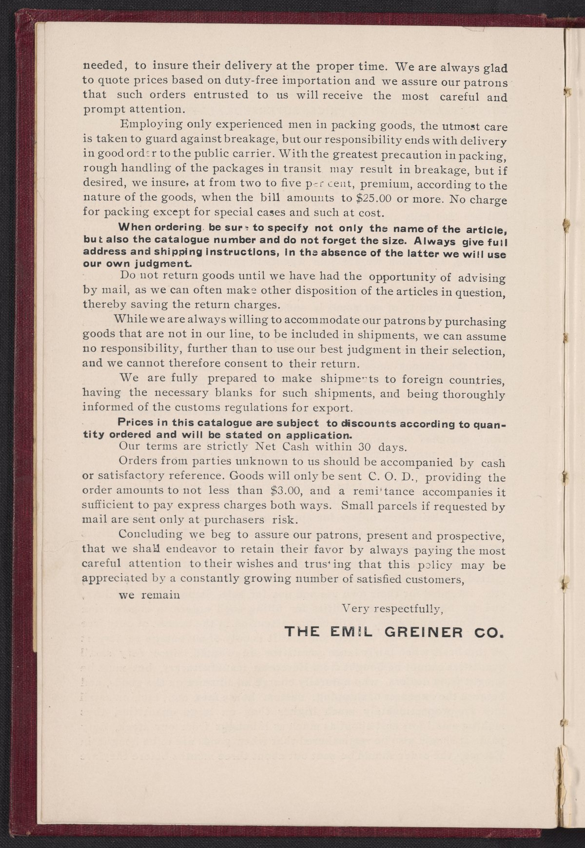 Catalog of scientific apparatus for chemical laboratories sold by the Emil Greiner Company. Promising superior quality and prompt delivery, the catalog includes items for sale such as burners, burets, pipettes, and Geissler tubes. The glassware sold by the Greiner Company was molded by the company's European corporate partner, Franz Schilling, who ran a prosperous glassworks in Gehlberg, Germany from 1874 to at least 1925. The volume is fully illustrated with engraved depictions of available glassware products.