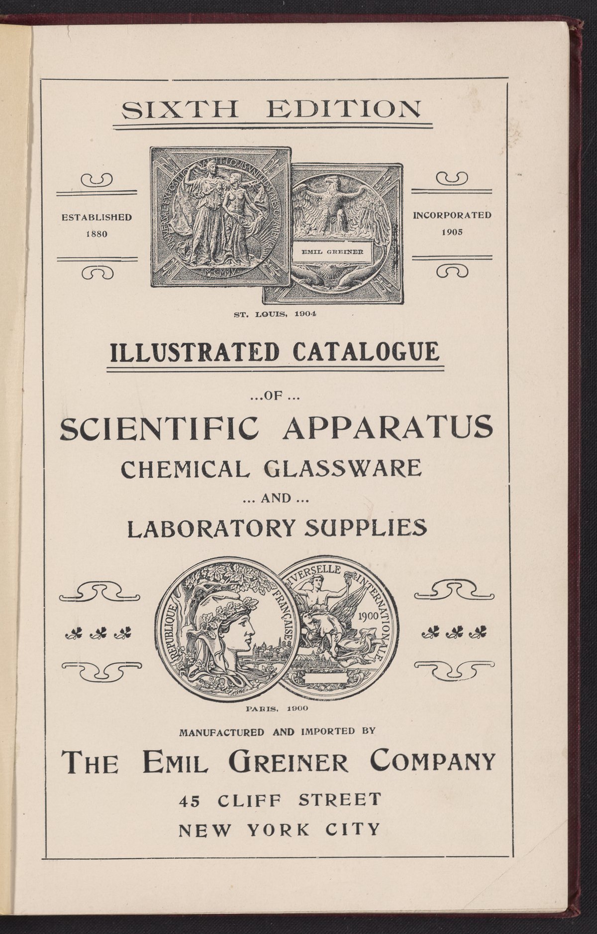 Emil Greiner Company. “Illustrated Catalogue of Scientific Apparatus, Chemical Glassware, and Laboratory Supplies.” New York (State): Emil Greiner Company, circa 1910. Q185.7 .E65. Science History Institute. Philadelphia. https://digital.sciencehistory.org/works/6lty65g.