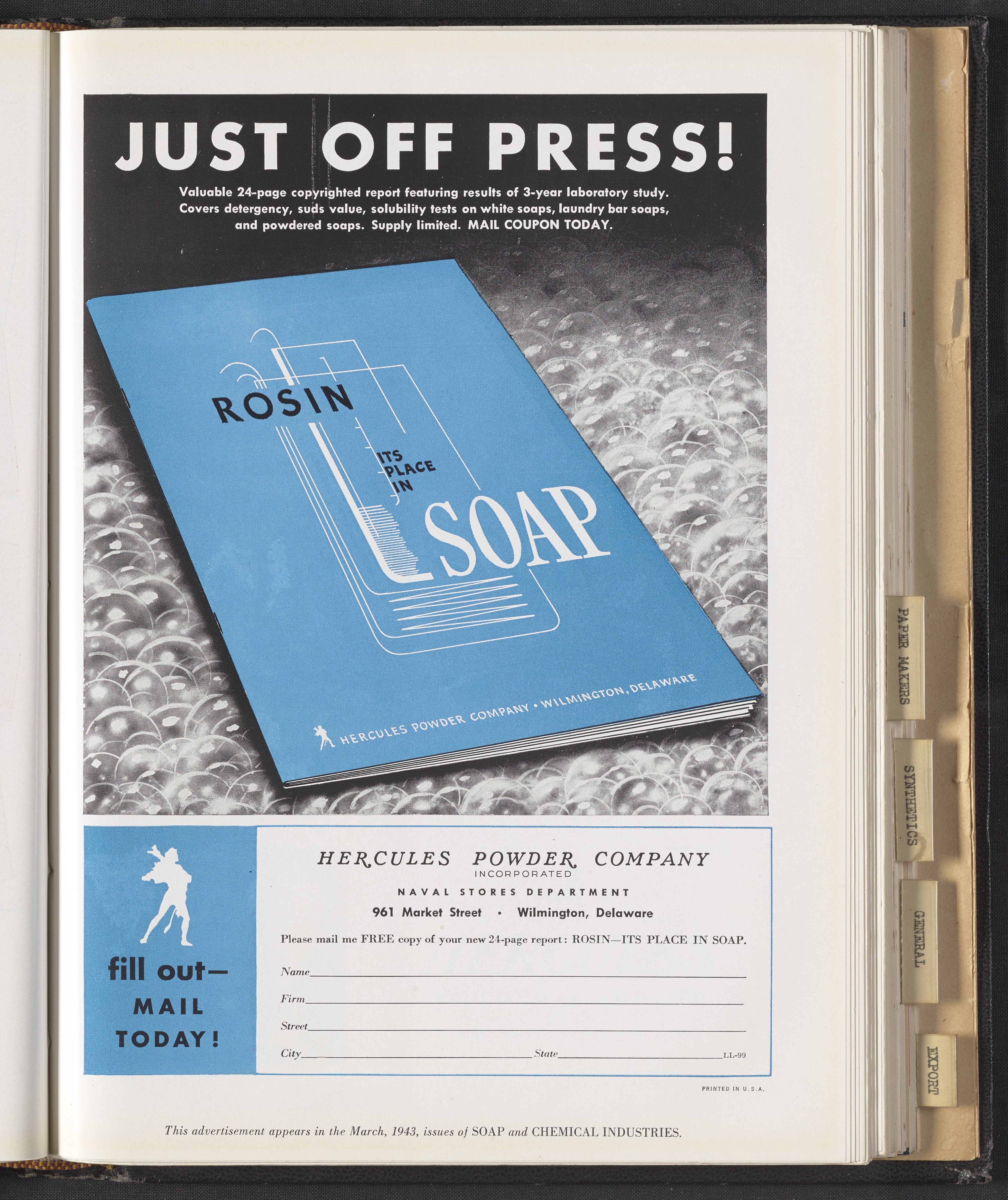 Advertisement and order form for Rosin: Its Place in Soap, a publication of the Hercules Powder Company detailing the results of a three-year laboratory study of the use of rosin in soap. This advertisement appeared in the March 1943 issues of Soap and Chemical Industries.